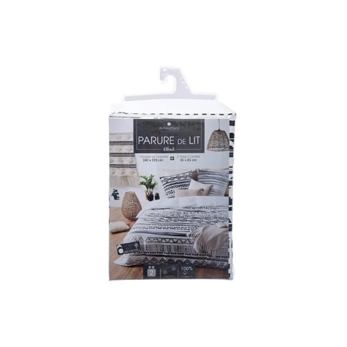 Commentaire vendeur : Informations Techniques : Dimensions : Housse de Couette : L. 240 x l. 220 cm Taie d'Oreiller : L. 65 x l. 65 cm Matière : Coton Spécificités : Tendance & Déco 57 fils/cm² Motif : Ethnique Fermeture à boutons Poids : 1,450 kg Couleur : Noir & Blanc
