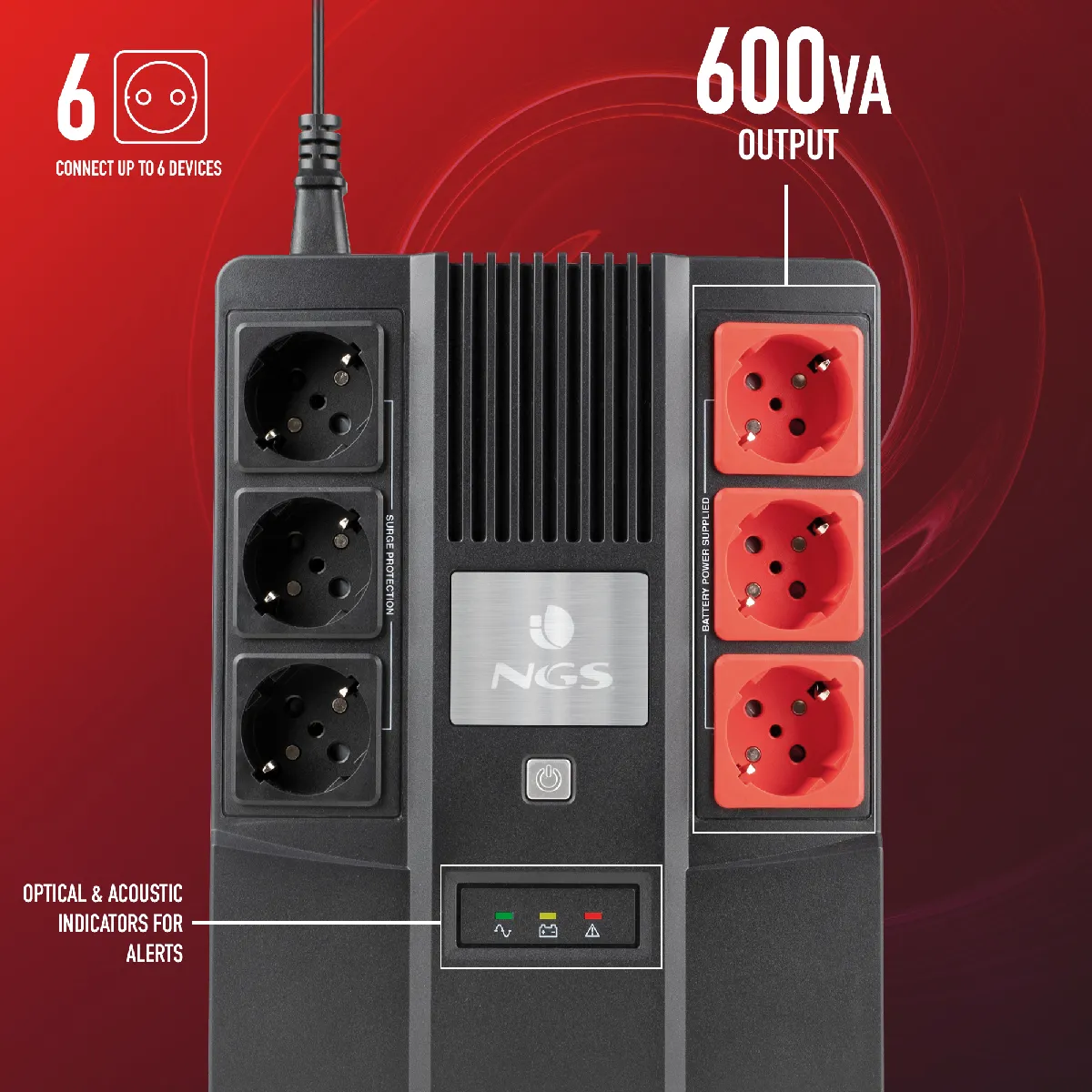 Onduleur hors ligne - 6 prises - Protection surtension et microcoupures - Batterie interne 12 V/7 Ah - Alarme et indicateurs LED