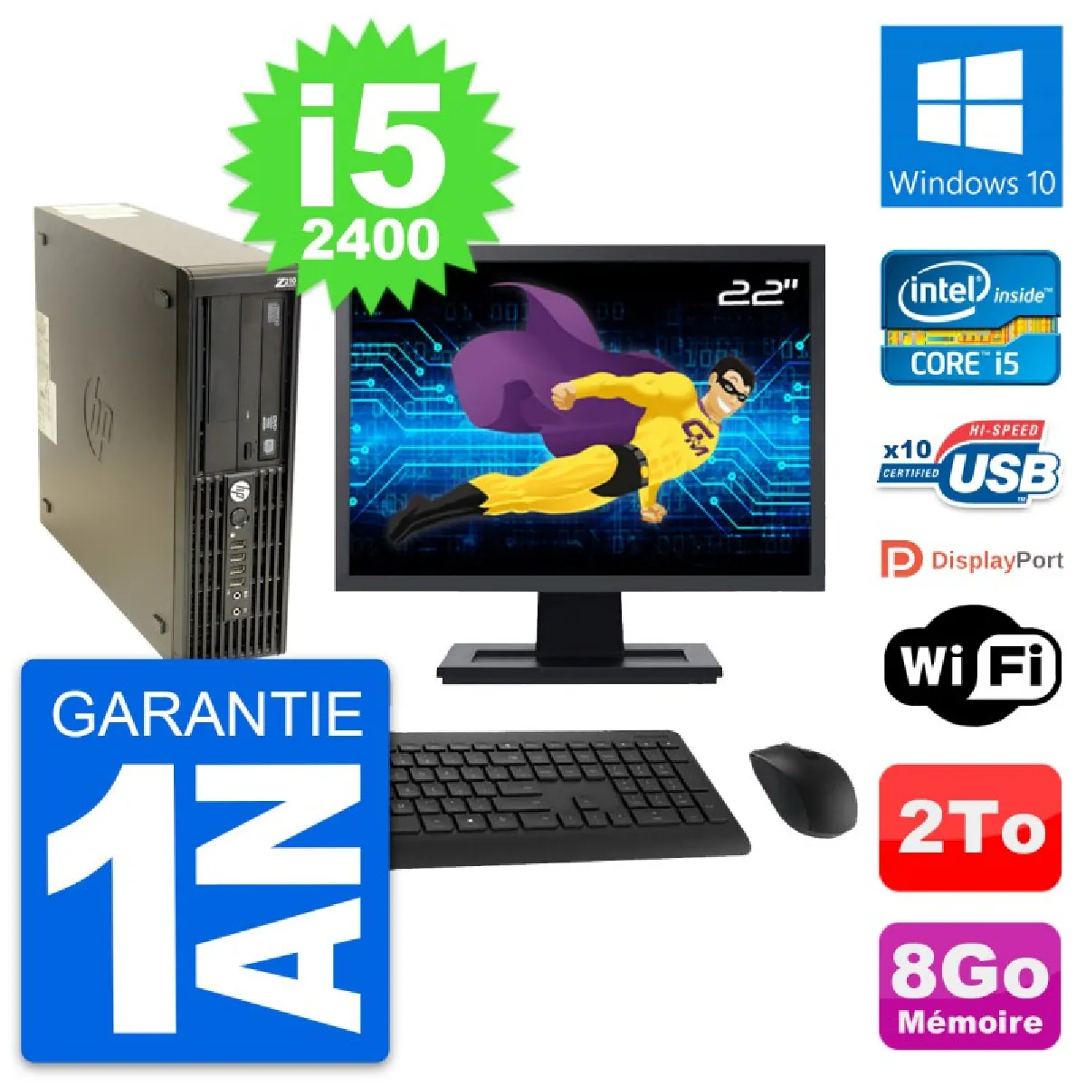 Livré avec Ecran 22" + clavier + souris (marques et modèles selon arrivages).