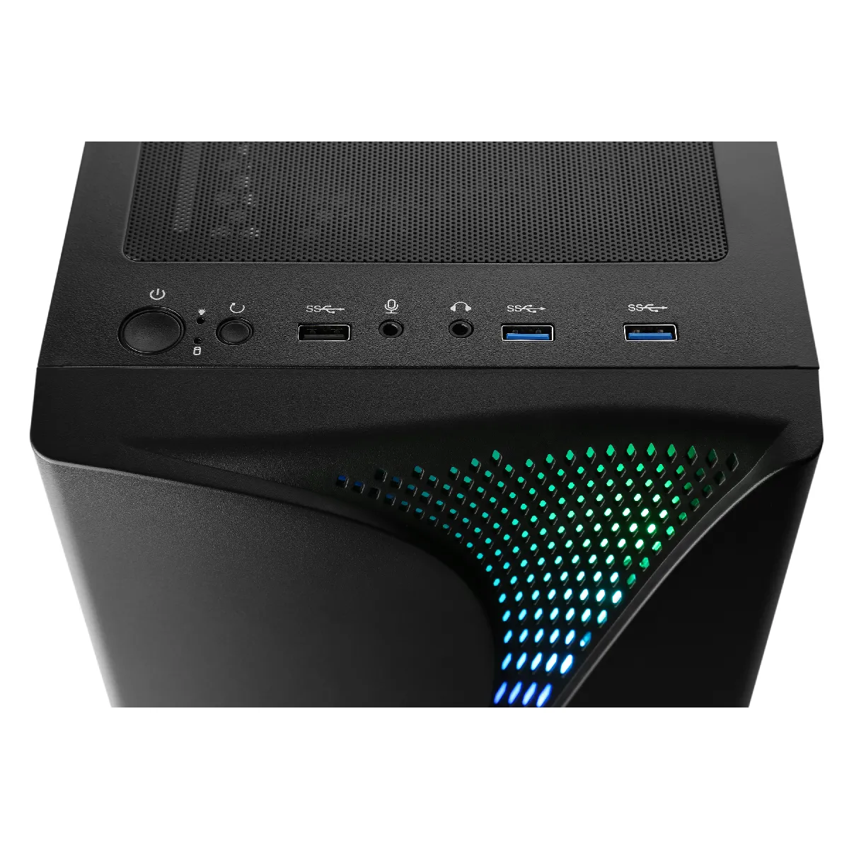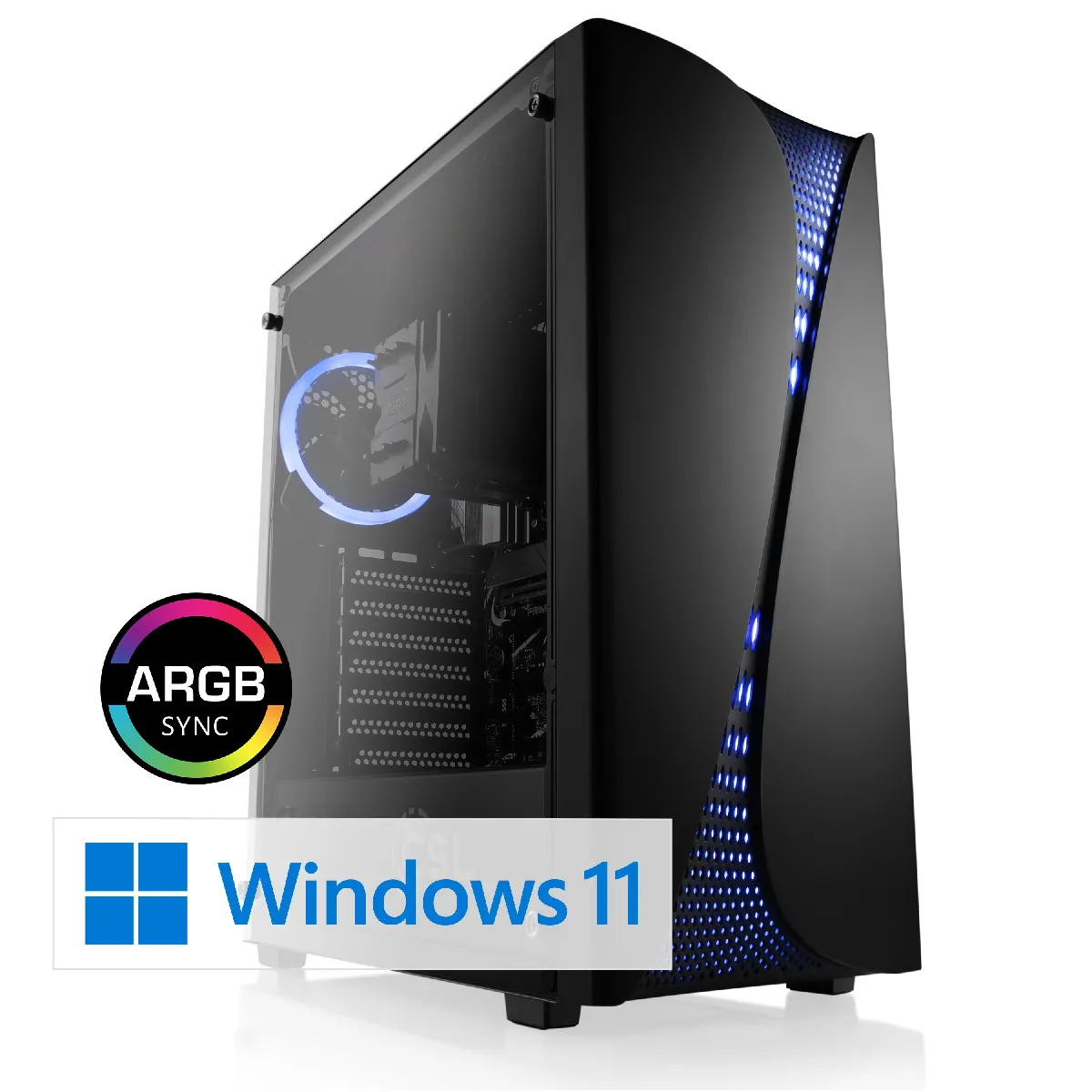 Boîtier: CSL Wave II noir, panneau latéral en verre, 1× ventilateurs aRGB, 2× USB 3.2 Gen1 en façade, 1× USB 2.0 en façade