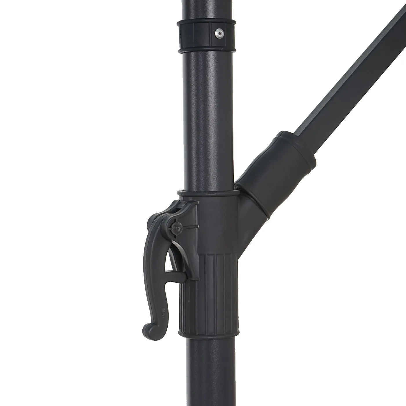 La structure en acier du mât Ø 45 mm et des baleines (env. 1,7 x 1 cm) assure une tenue fiable, complétée par une croix de pied de 98 cm compatible avec plusieurs modes de fixation. Selon le sol, il est possible d'utiliser des plateaux en béton ou un ancrage dans une dalle pour renforcer la stabilité. La toile en 100 % polyester résiste aux intempéries et à la pluie pendant un certain temps, tout en rappelant la nécessité d'un lestage adapté pour les bourrasques.