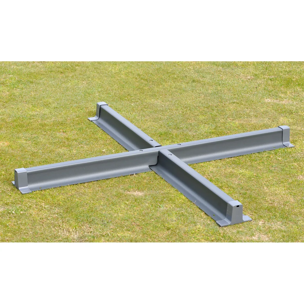 Le pied carrée 100 x 100 x 8 cm se compose de modules 50 x 50 x 5 cm pour un remplissage simple. À vide, il pèse 8,5 kg et atteint environ 64,5 kg rempli d'eau, ce qui augmente l'ancrage au sol. La croix percée permet plusieurs options de fixation : dalles en béton, vissage ou intégration au béton. Le rangement est facilité grâce à une structure destinée à économiser l'espace, utile en fin de saison ou lors des transports. Couleur de toile bordeaux, porte-parasol en anthracite.
