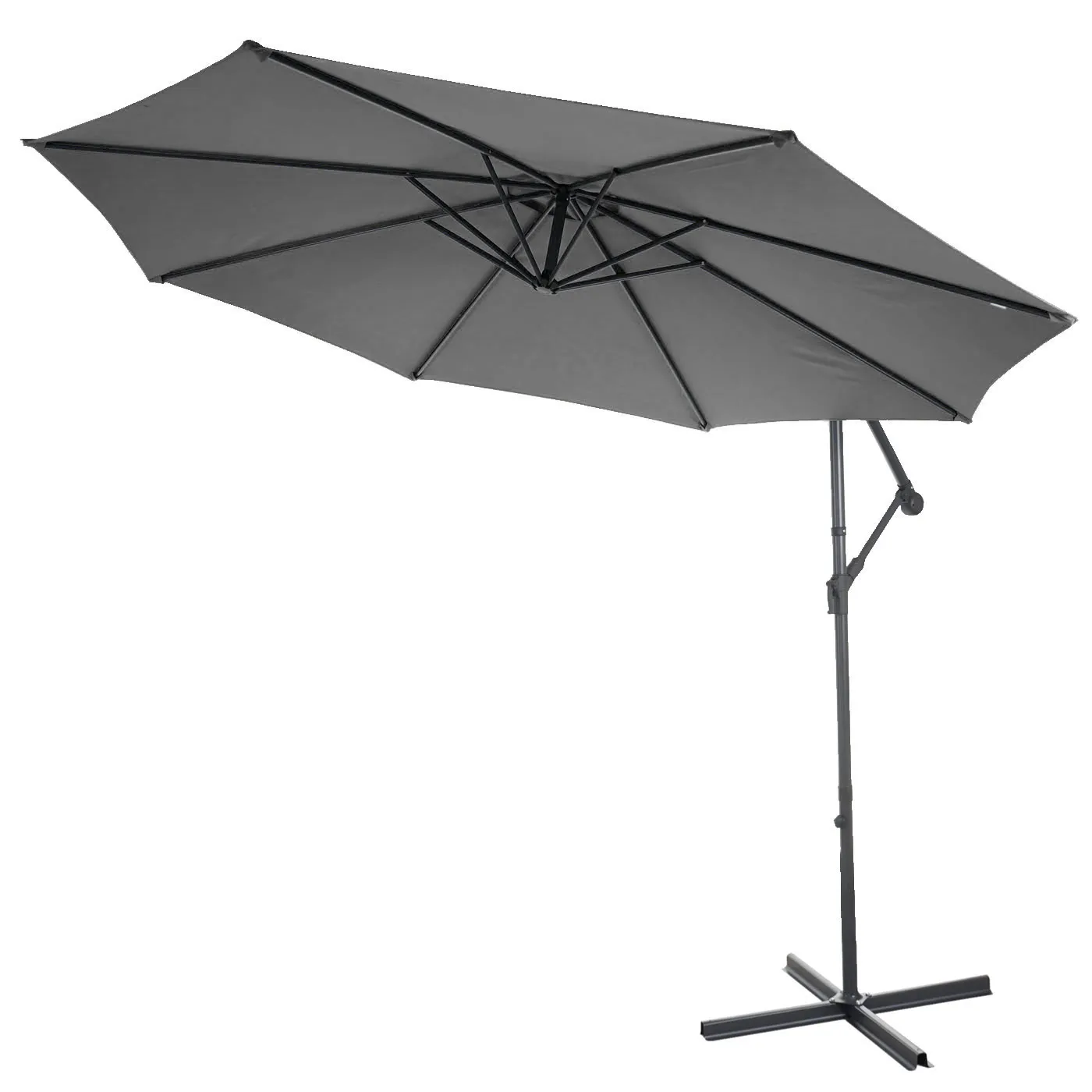 La structure en acier et les tiges renforcées offrent une stabilité appréciable pour un usage régulier. La toile en polyester, résistante aux intempéries et déperlante, supporte une exposition extérieure modérée. Le pied en croix de 98 cm accepte plusieurs fixations pour une implantation sûre sur dalle ou sur support dédié. Livré sans socle, l'ensemble reste simple à installer et à ranger grâce à des dimensions compactes une fois replié.