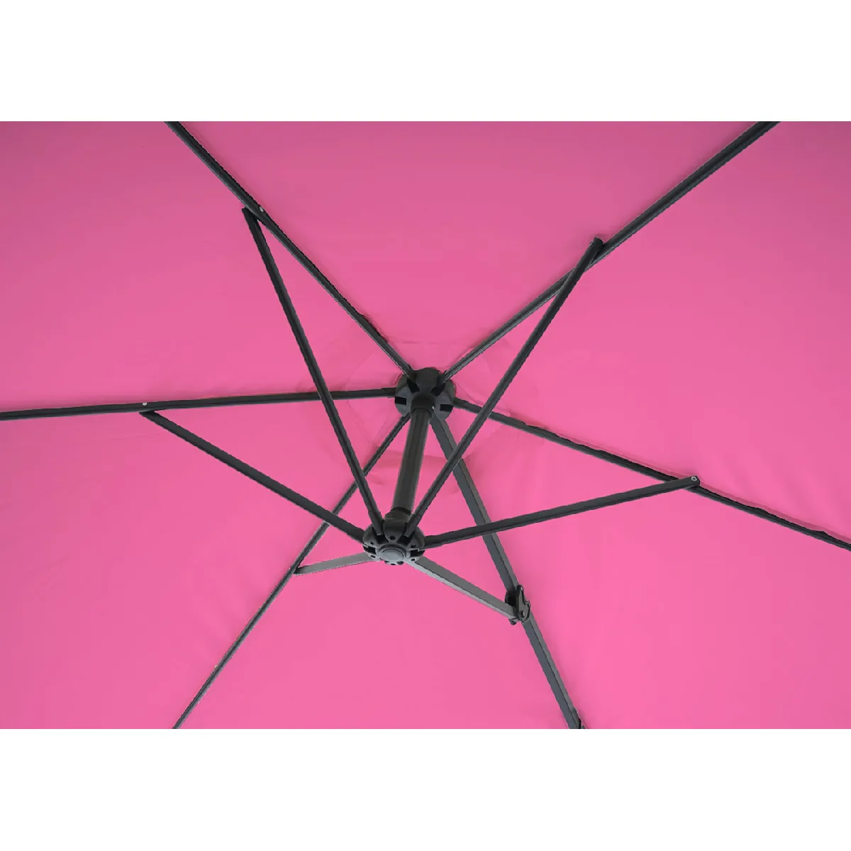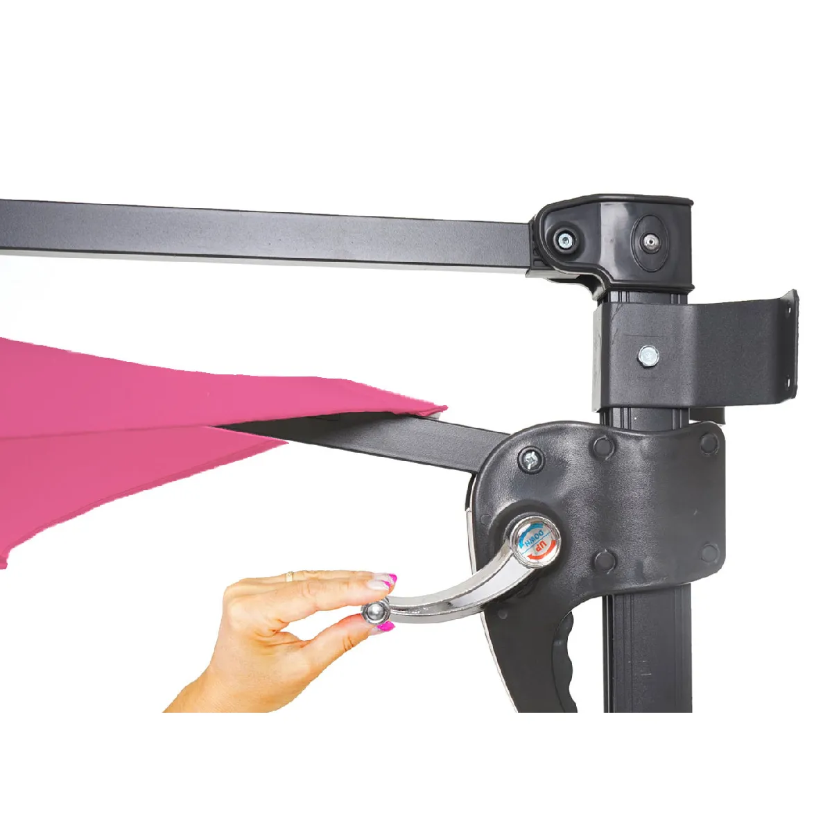 La toile rose en polyester 180 g/m² assure un abri confortable pour les déjeuners d'été. La hotte de ventilation au sommet contribue à la stabilité en cas de rafales en laissant l'air s'échapper. Le mât de 50 mm en aluminium et les entretoises acier 2 cm x 1 cm apportent une tenue fiable, tandis que la manivelle se retire facilement pour un rangement discret. Le montage mural est simplifié par le matériel de fixation fourni et les 6 supports. Résiste aux intempéries et à la pluie, sans exposition permanente recommandée.
