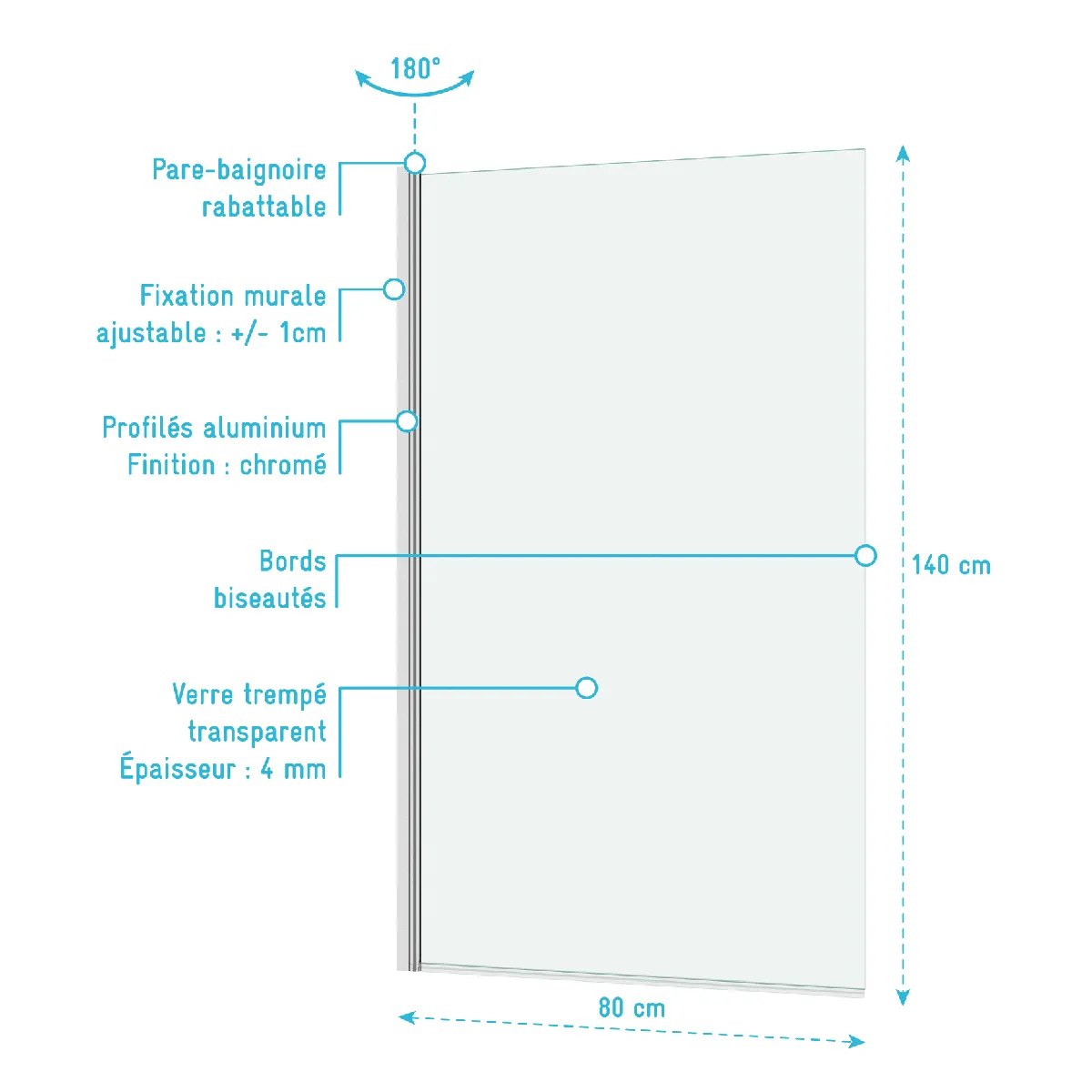 Paroi de baignoire rabattable - Verre trempé 4mm - Aluminium chromé