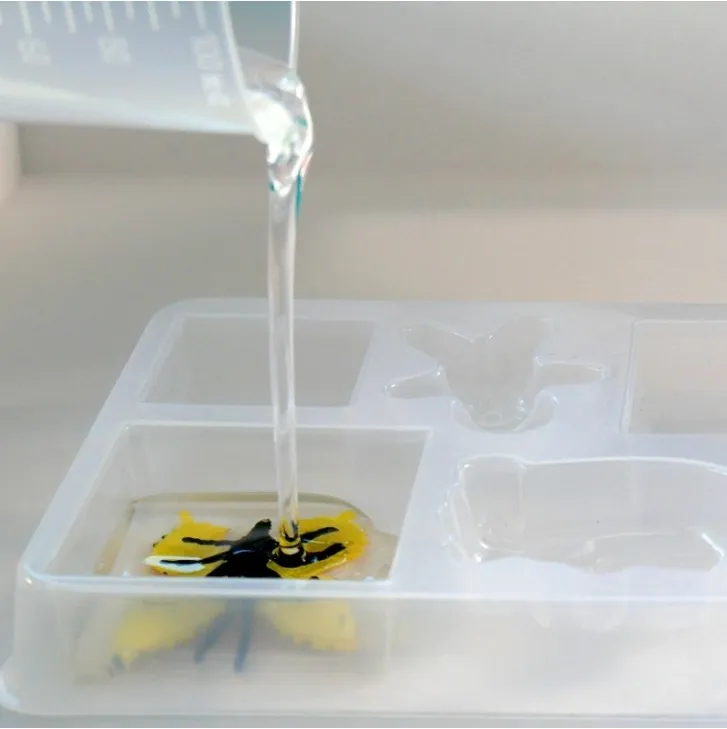 Ce coffret permet d'inclure de petits objets et de réaliser des pièces décoratives comme des porte-clés, des presse-papiers et des bibelots avec une résine transparente et son catalyseur. La palette de colorants rouge, jaune et bleu facilite les effets teintés ou couches superposées. Les moules fournis, dont un moule diamant en silicone et un moule à empreintes, aident à obtenir des formes nettes pour des créations régulières. Les pipettes et béchers assurent un dosage précis pour des inclusions homogènes.