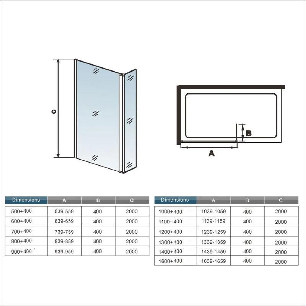 Les dimensions: largeur réglable de 120 x 200 cm, limitation des éclaboussures avec un volet pivotant à 180° de 400mm.