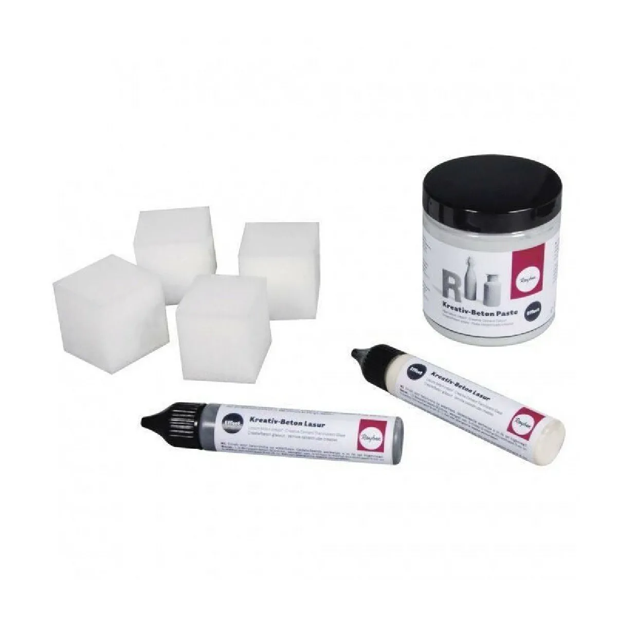Ce kit enduit de béton créatif donne un effet bétonné à vos supports tels que le bois, le papier mâché, le métal, etc. Transformez vos objets en leur donnant un aspect industriel. Comment utiliser le kit enduit béton de Rayher ? Nettoyez tout d'abord, le support à enduire. Appliquez une couche finde de pâte de béton sur toute la surface du support. Laissez sécher légèrement. De nouveau, lissez la pâte sur le support avec une éponge. Laissez maintenant sécher et durcir. Une fois sec, essuyez toute la surface avec une éponge propre. Terminez en passant la lasure noir ou blanche, en insitant sur les cavités. Ce kit contient : 1 pot de pâte effet béton de 250 ml, 2 stylos lasure béton créatif de 25 ml (blanc et gris), 4 éponges, 1 mode d'emploi A utiliser avec précaution.