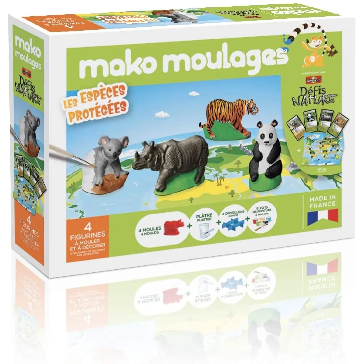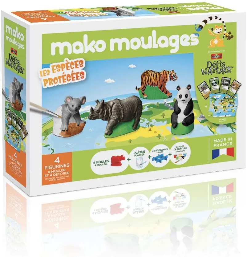 Commentaire vendeur : Coffret mako moulages Les Espèces Protégées avec 4 figurines à mouler et à décorer. Fabriqué en France. Un coffret créatif pour mouler, démouler et peindre 4 animaux : un panda, un koala, un tigre du Bengale et un rhinocéros de Sumatra. En cadeau, 4 cartes Défis Nature et 1 planisphère pour découvrir les espèces protégées les plus emblématiques dans le monde ! Prépare le plâtre, coule-le dans le moule, démoule et peins ! Les moules sont réutilisables à l'infini grâce aux recharges mako moulages. Contenu du coffret : 4 moules en latex, 1 sachet de plâtre refermable et zippé de 800g, 1 cuillère doseuse, 6 mini pots de peinture, 4 croisillons, 1 pinceau, 4 cartes Défi Nature, 1 planisphère et 1 notice de jeu. Un atelier créatif mako moulages, à partir de 5 ans.Cet article ne convient pas aux enfants de moins de 3 ans.Age minimum recommandé : 4 ansAge maximum recommandé : 12 ans