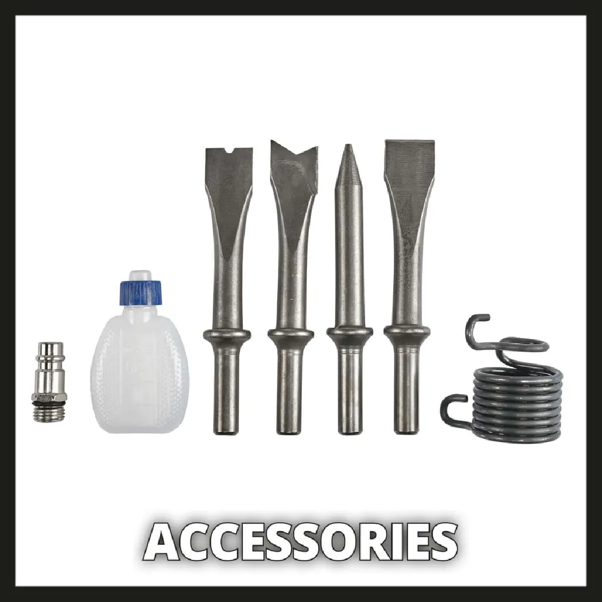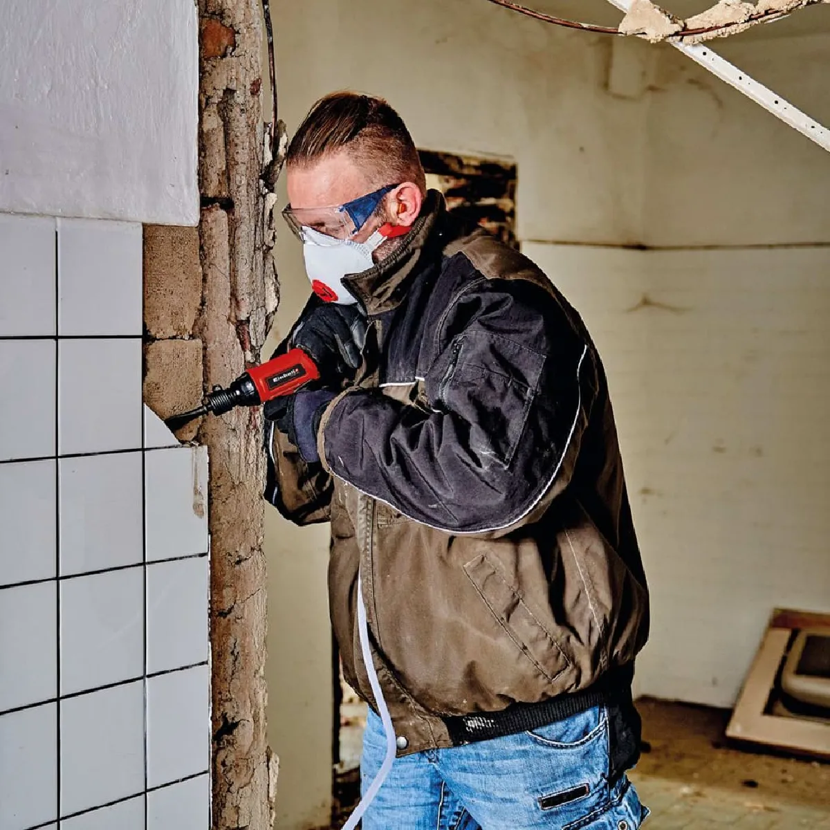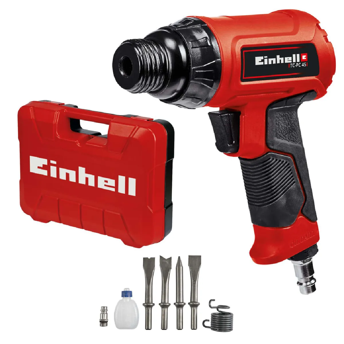 Le marteau pneumatique pratique et puissant TC-PC 45 de la marque Einhell est un outil universel pour travailler sans effort avec des matériaux en pierre ou en métal lors de travaux de démolition et de rénovation à la maison, dans l'atelier et le garage. La poignée caoutchoutée antidérapante permet un fonctionnement confortable et une prise sûre pendant le travail. Le ciseau est maintenu fermement par le mandrin hexagonal. Il fonctionne mieux avec un tuyau d'un diamètre intérieur de 9 mm ou plus. L'outil fournit une vitesse de soufflage allant jusqu'à 4 500 min ^ -1 pour une puissance d'impact allant jusqu'à 1,2 joules avec une pression de fonctionnement maximale de 6,3 bar. Ce marteau permet d'effectuer facilement un large éventail de tâches difficiles. Le marteau est livré avec un ensemble complet de burins de 120 mm en quatre pièces pour de nombreuses applications et accessoires dans une mallette de rangement robuste.