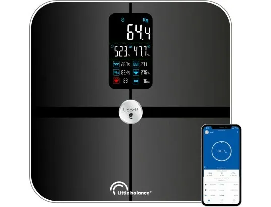 Pèse-personne impédancemètre connecté - Bluetooth - écran VA 8 affichages - électrodes invisibles - appli dédiée - rechargeable USB-réparable