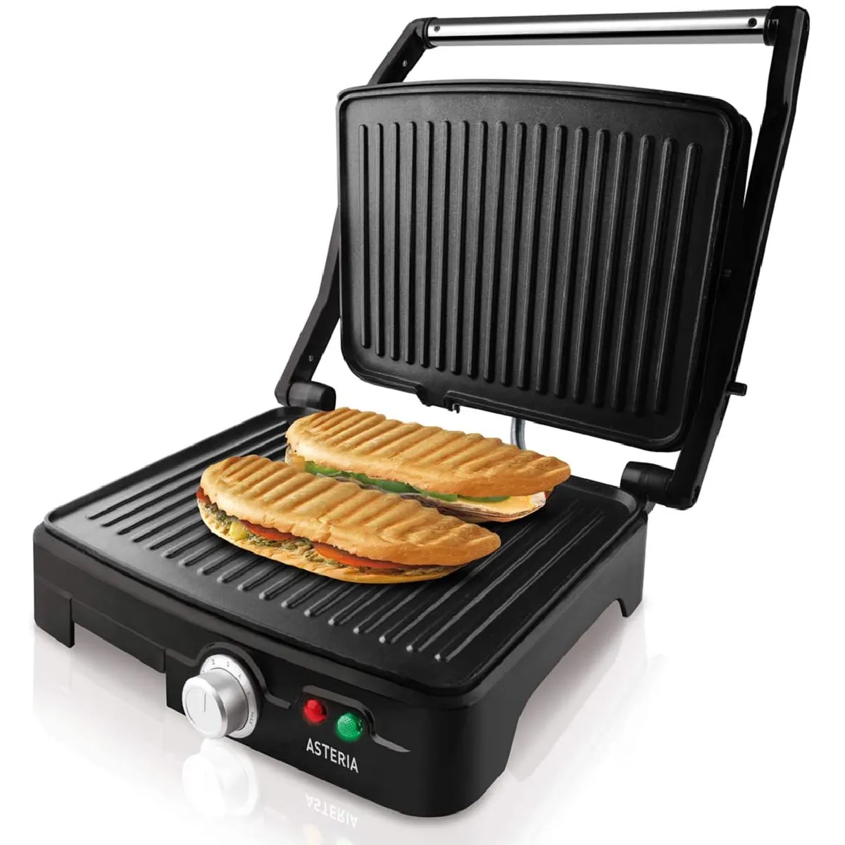 Grill électrique - ouverture 180° - plaques antiadhésives - bac récupérateur - thermostat réglable - 2200 W