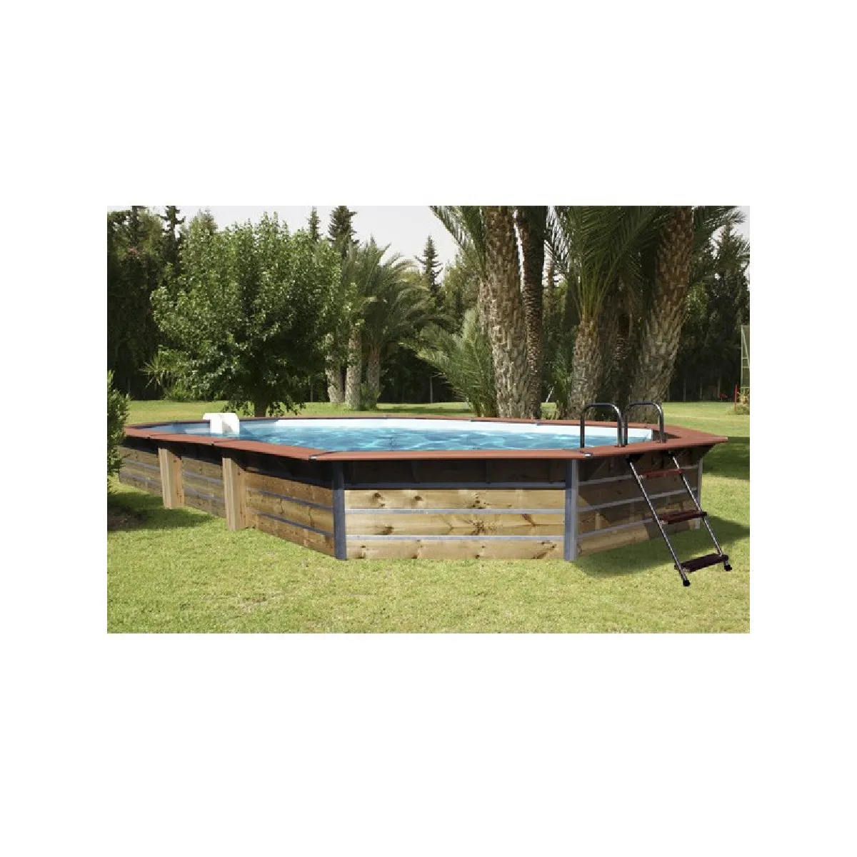Piscine en bois haut de gamme, facile et rapide à monter, assemblage rapide en 2h (hors terrassement et remplissage) sans outils grâce à ses panneaux prémontés, nécessite aucun percement du liner. Installation sur dalle en béton de 15 cm d'épaisseur avec kit acier à intégrer dans le béton en hors-sol, semi-enterrée ou enterrée. Structure 12 panneaux pré-assemblés en pin traité au Tanalith couleur pin et aluminium. 2 margelles en pin traité classe IV. Liner 70/100 avec accroches PVC. Dimensions : 730 x 420 x 129 cm. Volume : 29 m3. Livré avec un ensemble de filtration sur platine avec pompe 0,75 Kw équipée d'un pré-filtre, filtre à sable PVC 11 m3/H (vanne 6 voies et matière filtrante (sable) fourni), Skimmer PVC avec éclairage avec refoulement et kit de raccordement de filtration diamètre 38 mm et échelle intérieure inox et échelle extérieure bois. 730 x 420 x 129 cm 29 M3 HORS-SOL SEMI-ENTERREE ENTERREE Sur dalle béton de 15 cm avec kit acier à intégrer dans le béton 24 panneaux pré-assemblés en usine. Bois : Pin du nord traité Tanalith couleur pin et aluminium 2 margelles en pin traité classe IV Epaisseur : 45 mm et Largeur : 2x 14 cm Liner 70/100 avec accroches PVC Ensemble de filtration sur platine avec pompe 0,75 Kw équipée d'un pré-filtre, filtre à sable PVC 11 m3/H, vanne 6 voies et matière filtrante (sable) fournie Kit hors bord avec skimmer en PVC avec éclairage et refoulement + kit de raccordement de filtration diamètre 38 mm Feutre de fond Echelle intérieure inox et Echelle extérieure en bois Structure : 10 ans dégressifs Liner : 2 ans dégressifs Margelles : 5 ans dégressifs Composants électriques : 2 ans