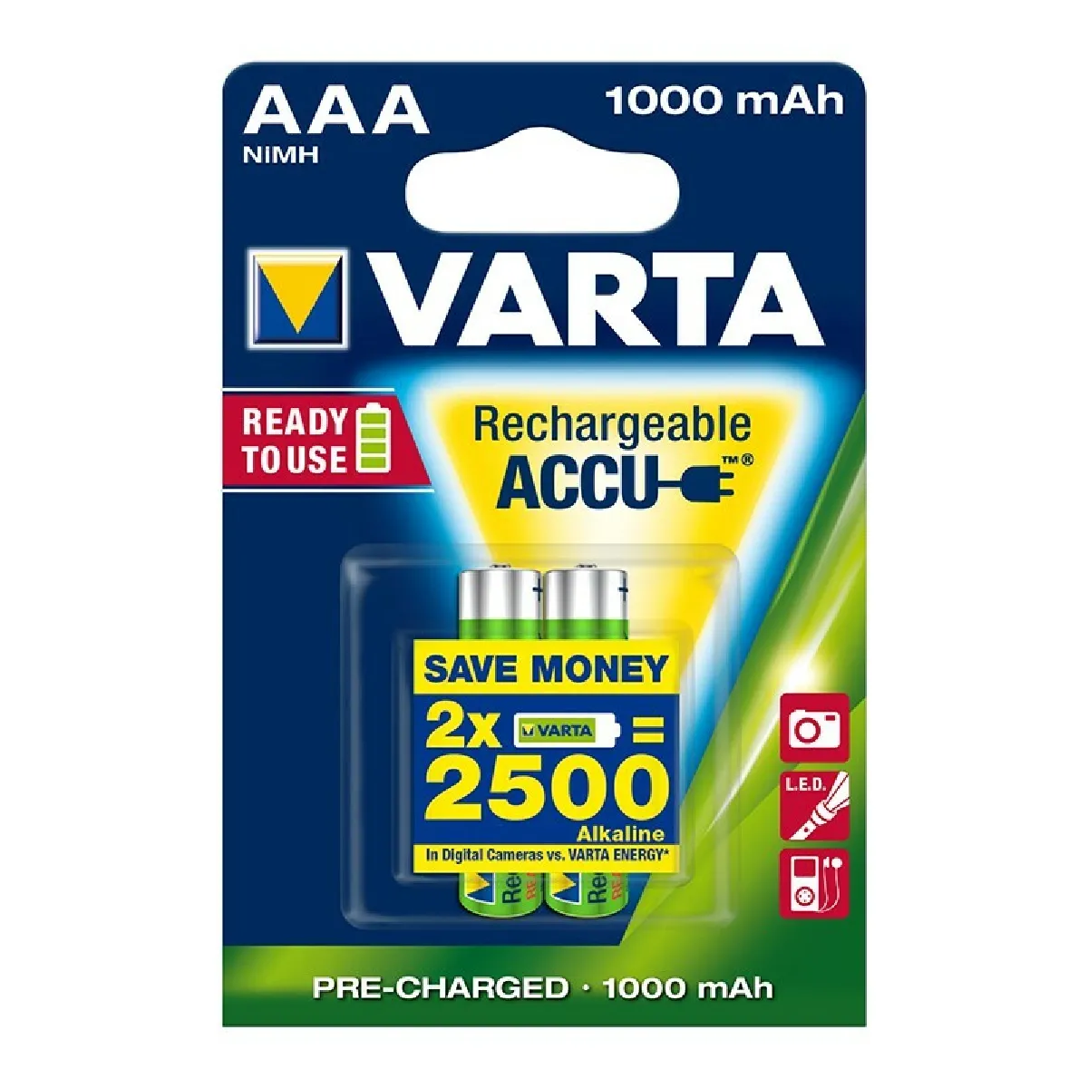 - Type : AAA, NiMH, 1,2 V, capacité 1000 mAh