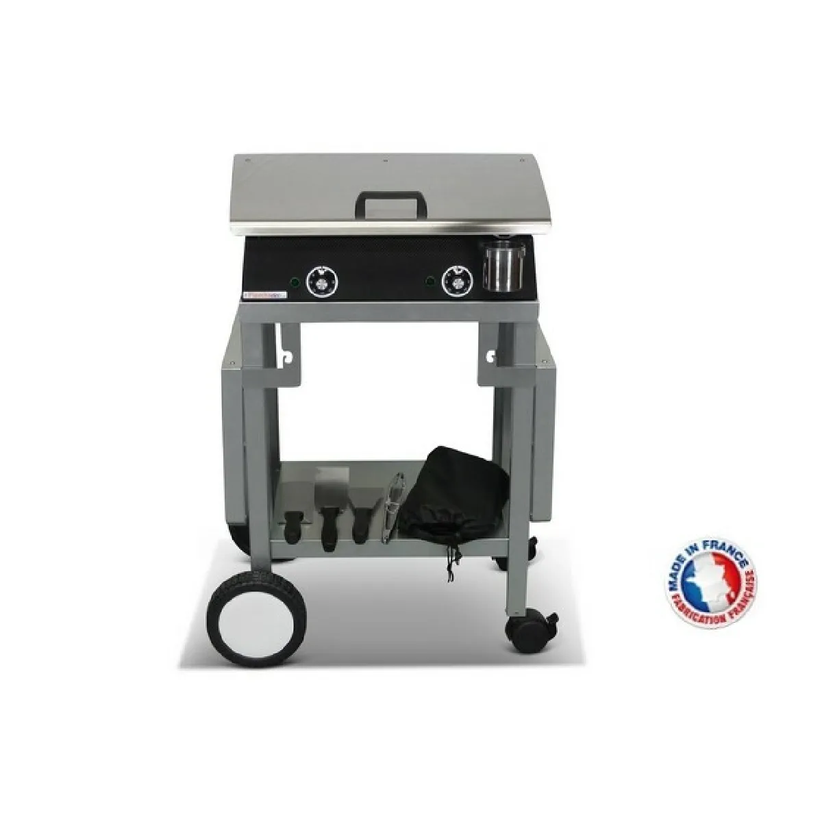 Pour des déjeuners en extérieur, sur la terrasse ou dans le jardin, ce kit avec ces accessoires est parfait pour vous ! il n'est pas seulement performant, il est également design. Idéal pour 10 personnes. 8 articles constituent ce pack : une plancha LUX 600 CARBON tout inox : . Dimension : L60 X P45 X H20 cm. 2 zones de cuisson indépendantes. 2 thermostats indépendants de 50° à 300°. Bol de récupération des graisses amovible. Les 3 bords de la plancha ont une hauteur de 7 cm chacun. Surface de cuisson : 55 X 40 cm. Plaque de cuisson en inox alimentaire épaisseur 4 mm. Puissance 2400 W. Poids : 20 Kg. Plancha muni de 4 pieds. Cordon d'alimentation de 2 mètres. La finition CARBON à un effet moderne. Cette finition est créée pour l’extérieur. Fiable & robuste le chariot Monceau est en acier MAGNELIS (acier qui a subi un traitement pour ne pas rouiller à l'extérieur) il est composé de 4 roulettes dont 2 pivotantes et freinées pour la mobilité. Pour faciliter le rangement les tablettes latérales sont rabattables. Vous y trouverez aussi 1 étagère basse. Le Chariot est livré en pièce détachées. La Notice de montage est fournie. Le chariot mesure H88cm – 76cm (replié) x P41cm x L125cm/70cm (replié) – Poids 12kg. Dimensions tablettes 34 x 41cm – Largeur entre tablettes 56.5cm (600). Livré avec 4 ustensiles : une pince de service, une spatule courte et une spatule longue pour retourner les aliments, une spatule grattoir. Le couvercle & la housse sont également fournis. Matériel conçu et fabriqué en France.