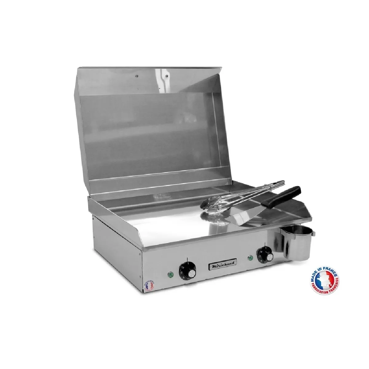 Profitez de cette offre exceptionnelle. Appareil conçu pour 8 personnes maximum. Matériel tout inox. Dimension : L53 X P43 X H18 cm. 2 zones de chauffe indépendantes. 2 Thermostats indépendants de 50° à 300° . Bol de récupération des jus amovible. Les 3 bords de la plancha ont une hauteur de 5 cm chacun. Surface de cuisson 52 x 40 cm. Plaque de cuisson en inox alimentaire épaisseur 3mm. Puissance : 2400 W. Poids : 14 kg. Plancha avec 4 pieds. Le cordon d'alimentation mesure 2 mètres. Norme IPX4. Branchement sur simple prise électrique 230V/16A. Avec cette plancha vous aurez un couvercle en inox et nous vous offrons une spatule grattoir pour le nettoyage et une pince de service bien pratique pour retourner les aliments sur la plancha. Matériel conçu et fabriqué en FRANCE. Plancha à usage domestique uniquement
