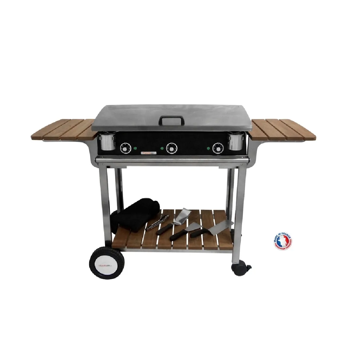 Offrez-vous ce splendide pack pour un prix somme toute très performant. Dans ce pack, nous vous proposons : 1 plancha LUX 830 CARBON : La plancha a une puissance de 3600W, 3 zones de cuisson indépendantes, 3 thermostat réglables de 50° à 300°, 3 rebords de 7 cm de haut chacun. 2 bols de récupération des graisses amovibles. Matériel tout inox. Dimension : L83cm x P43cm x H20cm. 15 personnes. Surface de cuisson : 75 x 40 cm. Poids : 27 Kg. La finition de la plancha à un aspect "CARBONE" qui lui donne un look très moderne (le vinyle employé est spécialement conçu contre les aléas climatiques et la chaleur de la plancha) Vous aurez également 1 chariot en bois et en inox de grande qualité pour poser votre plancha, 1 couvercle en inox pour cuisiner vos recettes, 4 ustensiles ( 1 petite spatule + 1 grande spatule + 1 grattoir pour le nettoyage + 1 pince de service) et pour terminer une housse pour recouvrir l'ensemble. Laissez-vous séduire par un équipement de qualité que vous garderez de nombreuses années. Informations concernant le chariot : La structure du chariot est en inox, les tablettes et l'étagère inférieure sont en bois massif (robinier) épaisseur 20mm. Les tablettes du chariot sont rabattables pour un gain de place. Il est équipé d'une barre à torchon en inox. Le chariot est monté sur 4 roues : 2 grosses roues + 2 roues pivotantes et freinées pour faciliter le déplacement et le maintien en place. Ce chariot restera tout l'été dans votre jardin sans aucun problème de détérioration. En effet, l'inox ne rouille pas et le bois employé est imputrescible. Ce bois est issu de forêts françaises gérées durablement. Le bois est recouvert en usine d'une huile écologique 100% naturelle qui le protège et lui donne son aspect naturel. Dimension du chariot tablettes rabattues : L850mm X P450mm X H760mm. Chariot livré en pièces détachées. Notice de montage fournie. Matériel conçu et fabriqué en France. Matériel à usage domestique uniquement