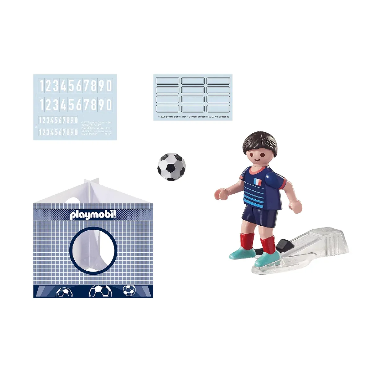 La figurine offre une fonction de tir à une main pour des frappes rapides, idéale pour s'exercer et enchaîner les séances de buts. L'ensemble inclut un ballon et une petite cage pour définir des scénarios d'entraînement réalistes dans un espace réduit. Le maillot arbore l'emblème de l'équipe de France et des numéros à appliquer, ce qui permet de personnaliser le joueur selon les préférences de l'enfant. L'ajout de ce personnage permet de compléter l'équipe du stade de football 71120 et d'étendre les possibilités de jeu autour des passes, tirs et arrêts du gardien.