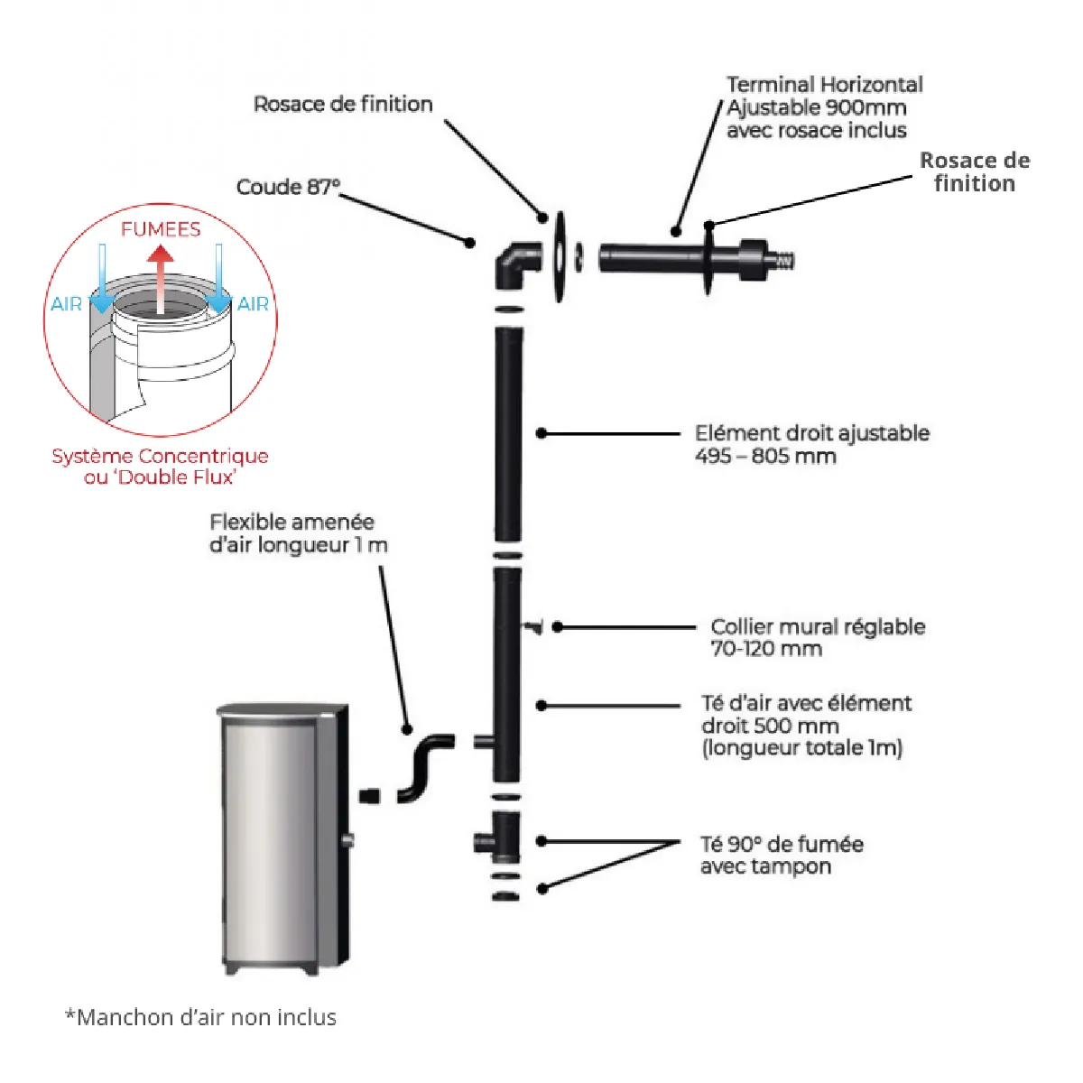 - 1 x Terminal horizontal ajustable 900 mm (500 mm maximum dans le mur + 400 mm à lextérieur de la maison pour respecter la norme. Si votre mur fait plus de 500 mm nous contacter pour rajouter une rallonge)