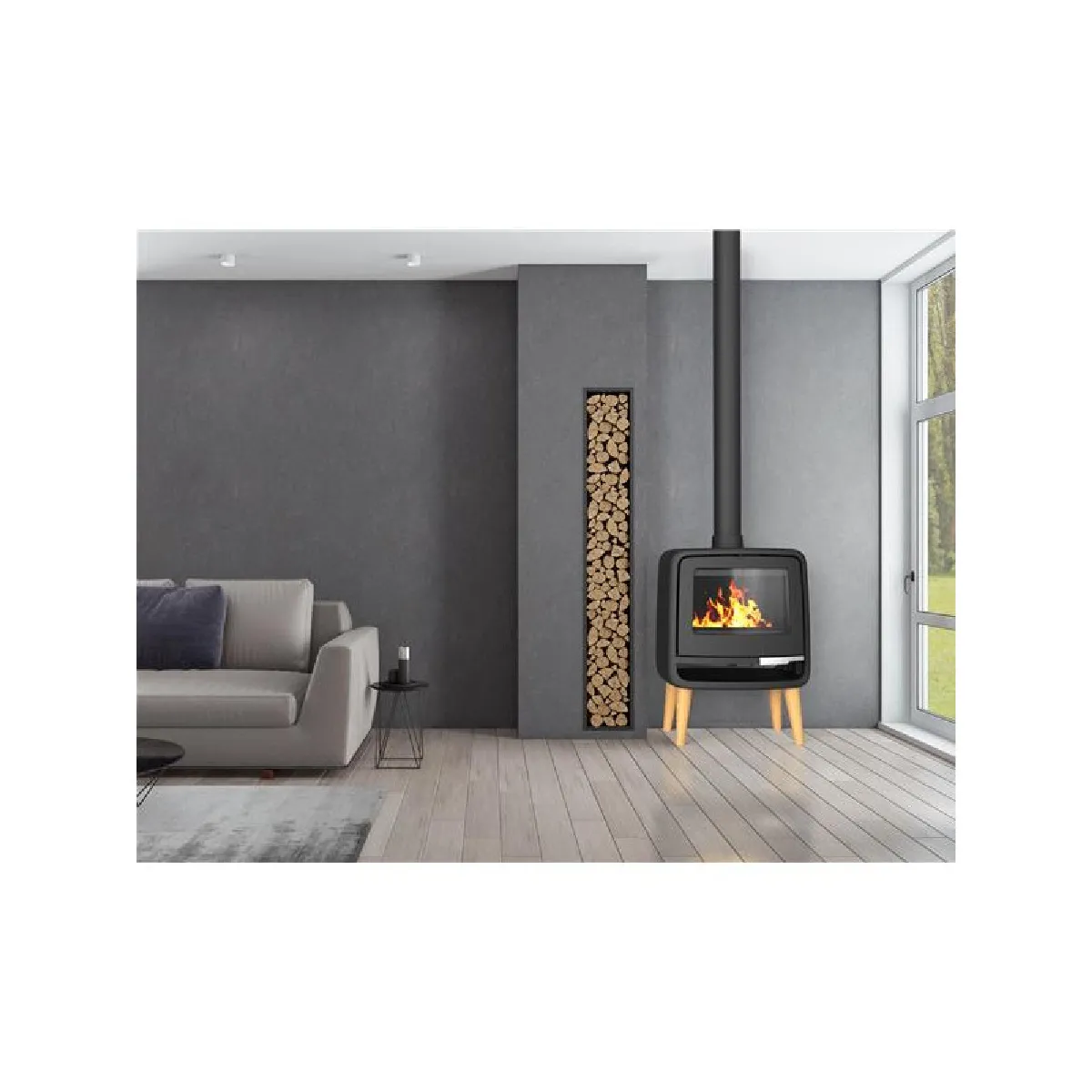 La porte frontale et latérale accélère les opérations de chargement, tout en favorisant la gestion des bûches jusqu'à 53 cm. Les pieds en bois de style scandinave apportent une stabilité associée à une esthétique discrète en finition noire. Le volume de chauffe de 200 à 250 m3 convient aux pièces spacieuses, tandis que la structure en fonte à graphite lamellaire et doublage fonte renforce la durabilité. Le poids net de 160 kg contribue à la stabilité de l'ensemble et à la restitution prolongée de la chaleur.