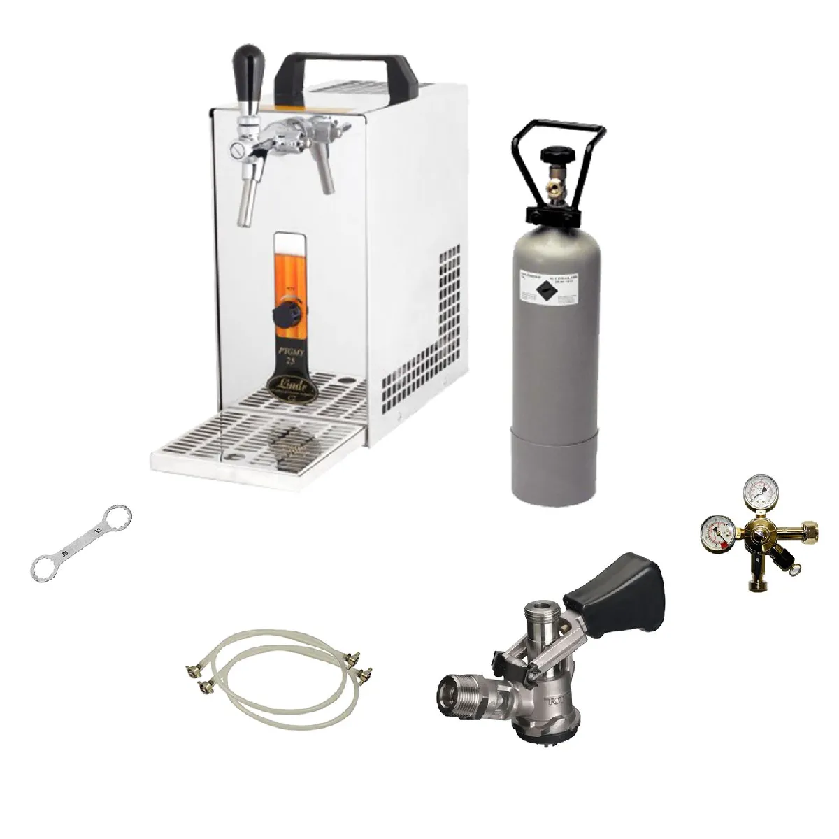 L'ensemble comprend un détendeur 1 ligne CO2 pour le tirage jusqu'à 3 bar, une bouteille CO2 2,0 kg et un tuyau CO2 de 1,5 m. Les connexions John Guest 3/8 po facilitent le branchement sûr et rapide, avec un tuyau à bière de 2,00 m terminé par connecteur à vis 3/8" et 5/8". L'outil de serrage pour l'acide carbonique dit « captive » aide aux manipulations de la ligne gaz. Cette configuration soutient un démarrage opérationnel en quelques minutes.