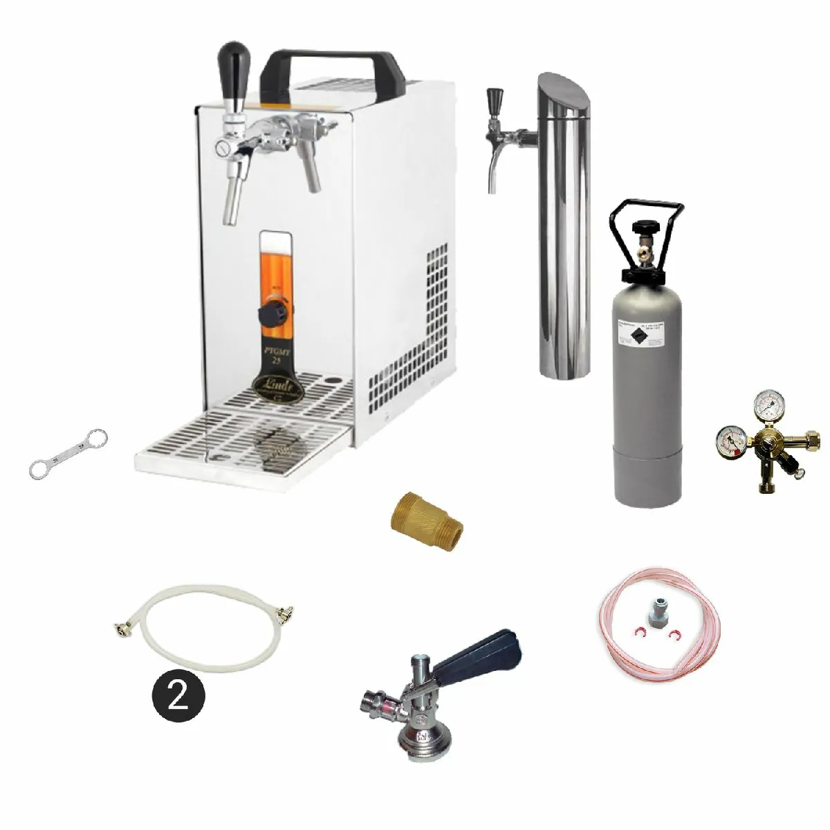 L'ensemble comprend la tireuse PYGMY 25 en acier inoxydable (1 sortie), la colonne brossée 1 ligne, un bac d'égouttage, le robinet compensateur de post-refroidissement et les flexibles prêts à l'emploi. L'équipement CO2 est fourni avec un détendeur 1 ligne 3 bar et une bouteille CO2 2,0 kg, ainsi qu'un tuyau CO2 complet de 1,5 m. Côté bière, le tuyau 7 mm prêt monté sur 3,0 m et l'ensemble de raccords John Guest 3/8" et 5/8" sur 2,00 m simplifient l'assemblage. Un adaptateur de nettoyage 30 mm et une clé pour l'acide carbonique complètent la maintenance courante.