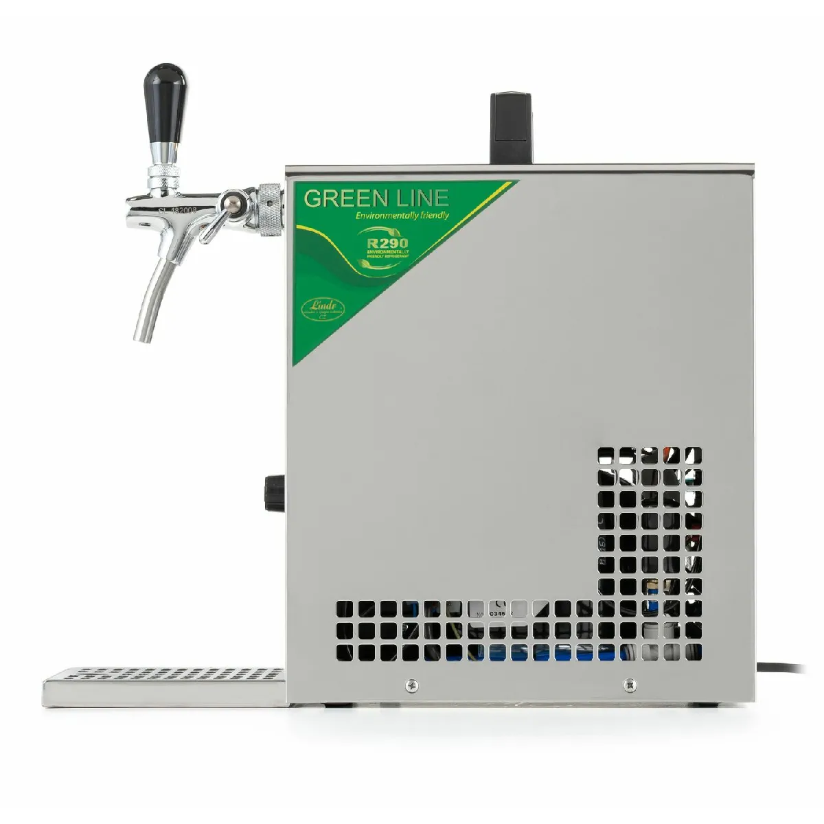 La tête de distribution est proposée au choix selon le type de fût, y compris un adaptateur 5 L pour une large compatibilité. Un raccord Gardena métallique facilite le rinçage lors du nettoyage. L'appareil dispose d'un unique bec de distribution pour un service maîtrisé, adapté aux postes de tirage dédiés ou aux bars temporaires. L'approche Green Line met l'accent sur une technologie de refroidissement plus efficace, tout en conservant une manipulation simple et des réglages accessibles pour l'utilisateur.