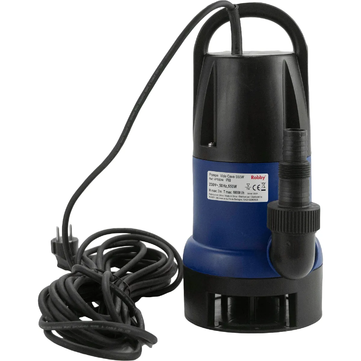 pompe immergée automatique à flotteur intégré 550w - vp550w - La pompe vide-cave Robby VP550W, très qualitative, facilitera les opérations d'évacuation d'eau claires ou chargées. Outre le pompage d'une cave inondée, elle permet de vidanger une piscine pour préparer la période hivernale, et peut également être utilisée pour plusieurs autres applications.Sa puissance de 550W lui permettra d'obtenir un débit max. de 10000 litres par heure.Elle possède un câble d'une longueur de 10m, lui permettant d'être immergée jusqu'à 7m de profondeur tout en restant étanche et sécurisée. Son flotteur intégré permettra à la pompe Robby de se déclencher automatiquement. Elle peut également être réglée sur la position manuelle pour une utilisation ponctuelle en continue.