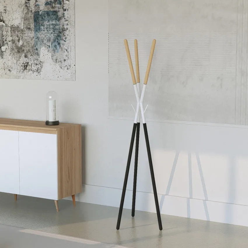 La base tripode assure une stabilité fiable au quotidien tout en restant légère et simple à déplacer. Sa structure en métal enduit de poudre supporte l'usage courant et s'intègre aisément dans un intérieur moderne. Avec ses 172 cm de hauteur et 3 patères, il accueille manteaux et vestes sans encombrer l'espace, tandis que le support central facilite le rangement d'accessoires comme sacs, écharpes ou chapeaux. Le contraste du noir mat et des éléments effet bois naturel renforce une esthétique scandinave sobre.