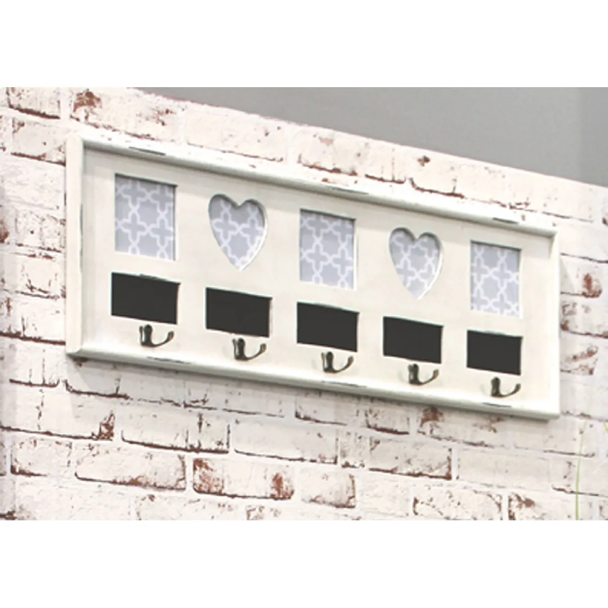 Garderobe murale coloris blanc antique, en bois massif/MDF laqué blanc antique, avec possibilité d'incription, 5 crochets et cadre integré. Dimensions : L 77 x P 3 x H 26 cm. Matière : bois massif/MDF. Coloris : laqué blanc antique