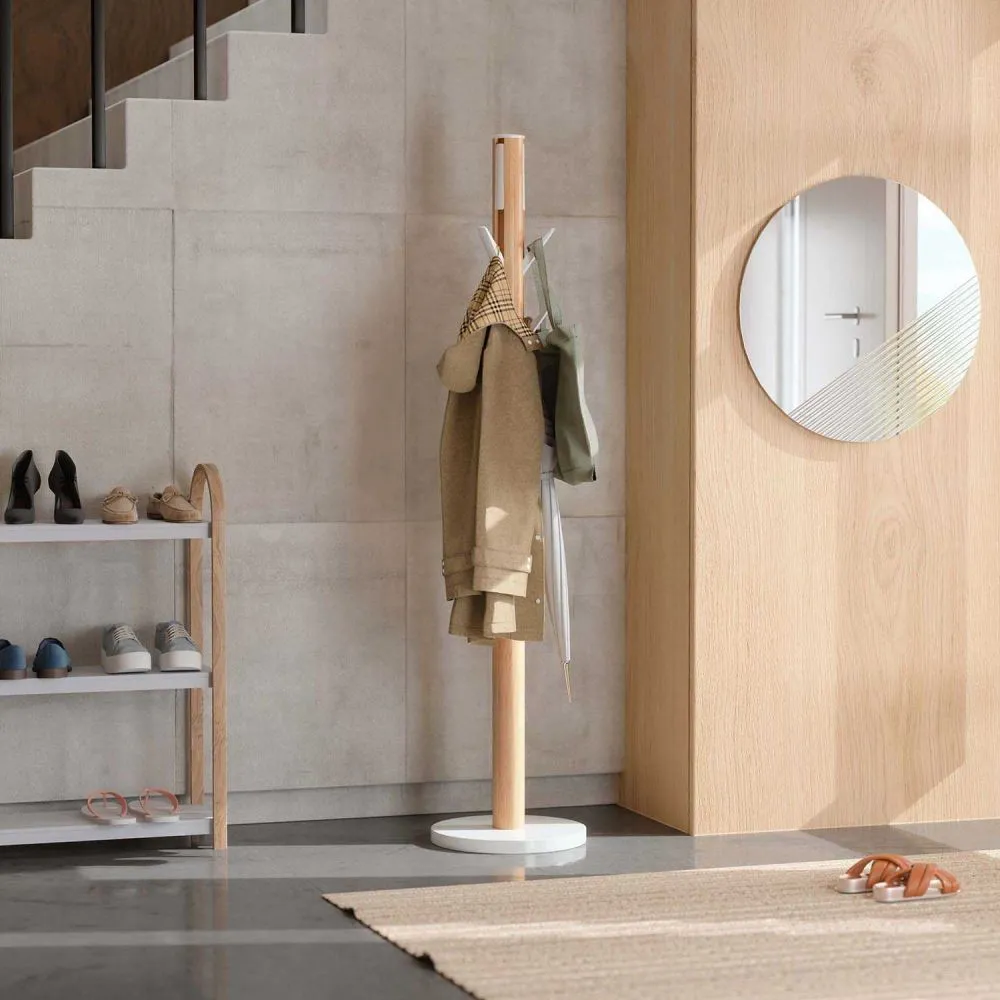 Le piètement circulaire aide à répartir la charge et limite les basculements lors de l'accrochage de pièces plus lourdes. Les crochets multiples permettent de séparer les effets de chaque membre du foyer et de garder l'entrée ordonnée. La finition naturelle s'intègre facilement avec des meubles clairs ou contrastés, tandis que la combinaison bois et métal assure durabilité et entretien simple : un essuyage suffit pour conserver l'aspect. Le format compact facilite le déplacement si l'agencement évolue, sans sacrifier la capacité d'accueil au quotidien.