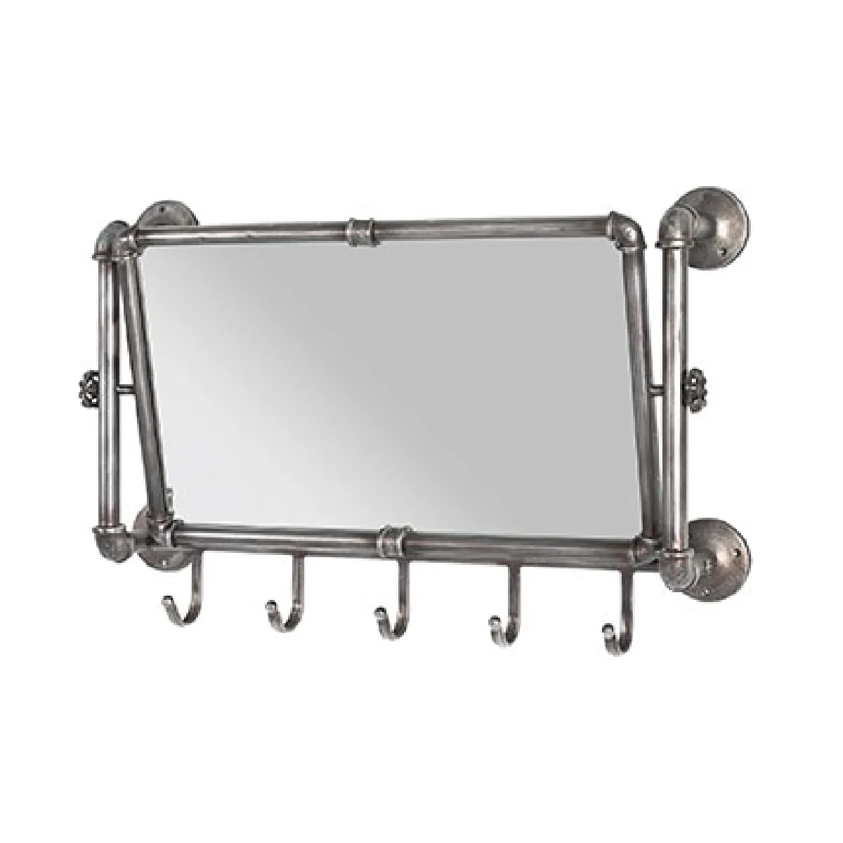 Ceci est un portemanteau mural 5 crochets avec miroir en métal argent, un article combinant le style vintage et industriel. Cet article est d'une praticité telle que vous pouvez le placer dans n'importe quelle pièce de votre demeure. Le rectangle du miroir est l'élément le plus visible sur ce portemanteau, ajouté des cinq crochets placés sur la bordure inférieure du miroir. Sa fixation au mur se fait à travers les deux combinés de téléphone tournant le dos sur chaque côté du rectangle. Ce portemanteau a été conçu avec du métal laqué, puis recouvert d'une finition argentée.