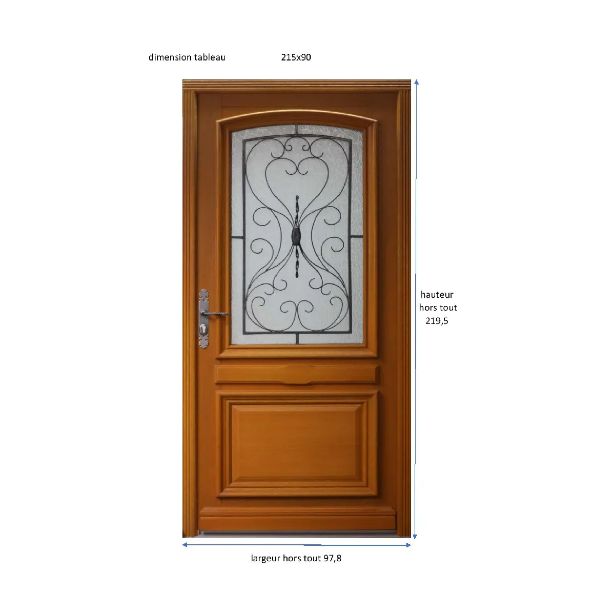 Porte d'entree en BOIS , 215x 90 POUSSANT DROITE(cote tableau); BOIS PRET A etre PEINT OU TEINTERCOTES HORS TOUT 219,5 X 97,8ouvrant et dormant de 46 mm d'epaisseur; chassis ouvrant avec vitrage 4/16/4 Decor faible emissivite + gaz ArgonCremone 6 points 4 fiches reglables sans degondage de la porte, 5 gaches reglablesSeuil alu anodise : hauteur du seuil et ouverture adaptees aux personnes amobilite reduite.Ces menuiseries recoivent en usine un traitement FIH.ce premier traitement doit recevoir obligatoirement 2 couches de finition apres la pose pour assurer une bonne protection.Faire par la suite un entretien regulierVous pourrez egalement peindre votre fenetre de la couleur de votre choix pour l'assortir a votre maison. Le Groupe de GD Menuiseries adhere aPLANETE URGENCE et participe al'operation 1â'¬ = 1 arbre plante