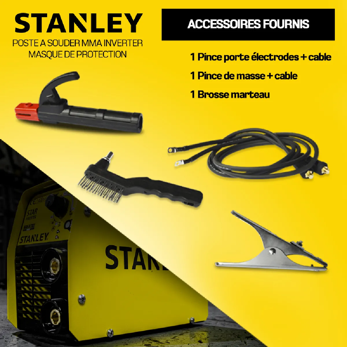 Accessoires fournis: pince porte électrodes, pince de masse, brosse marteau et un masque .