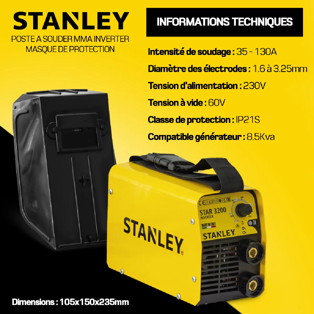 Ce poste à souder inverter Stanley fabriqué en Italie possède un puissance réglable de 35 à 130A.