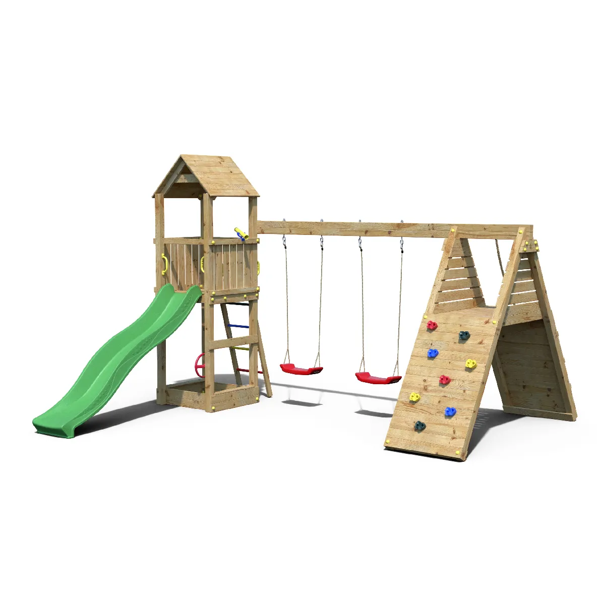 Transformez votre jardin en un véritable terrain d’aventures avec notre aire de jeux complet ! Équipée d’un toboggan vert de 2,2 m, d’un mur d’escalade, et d’une table pique-nique, cette structure offre un large éventail d’activités. Les deux sièges rouges, le volant, et la rampe avec corde stimulent l'imagination et le jeu actif. Fabriquée en Pin Sylvestre autoclave classe 3 FSC, elle garantit robustesse et durabilité. L’installation est simplifiée avec tous les outils et instructions fournis, réalisable en 8 heures (2 personnes). Dimensions : 3,75m (L) x 3,96m (l) x 2,72m (h) et une surface de 14,85 m²., pour 11 enfants maximum. Garantie de 10 ans.