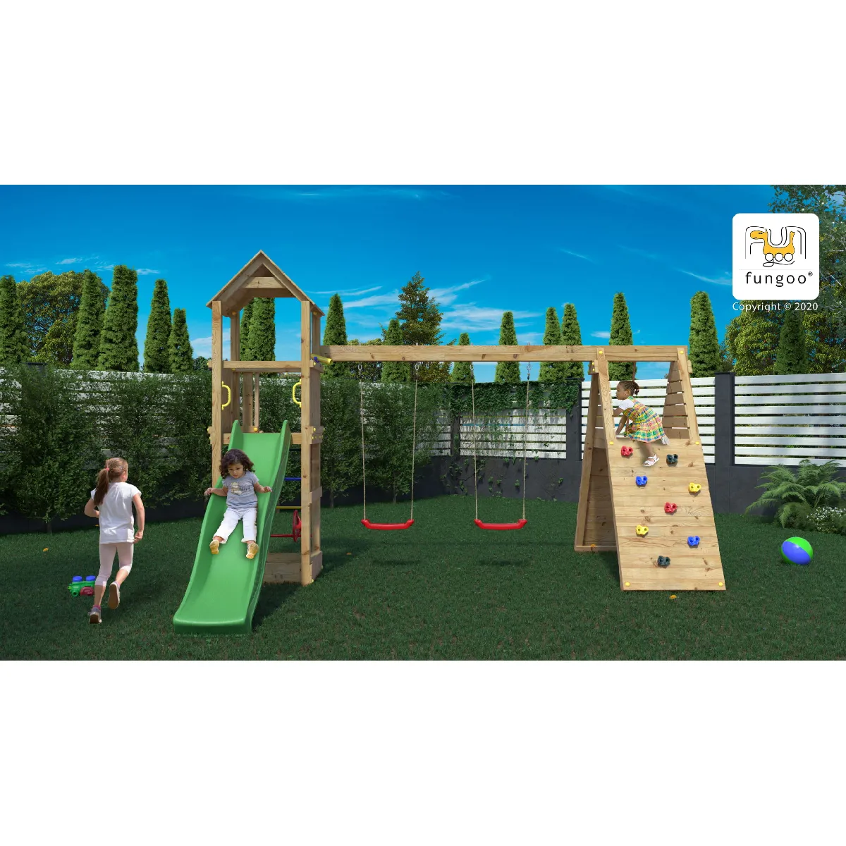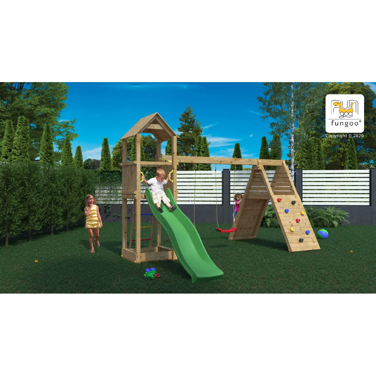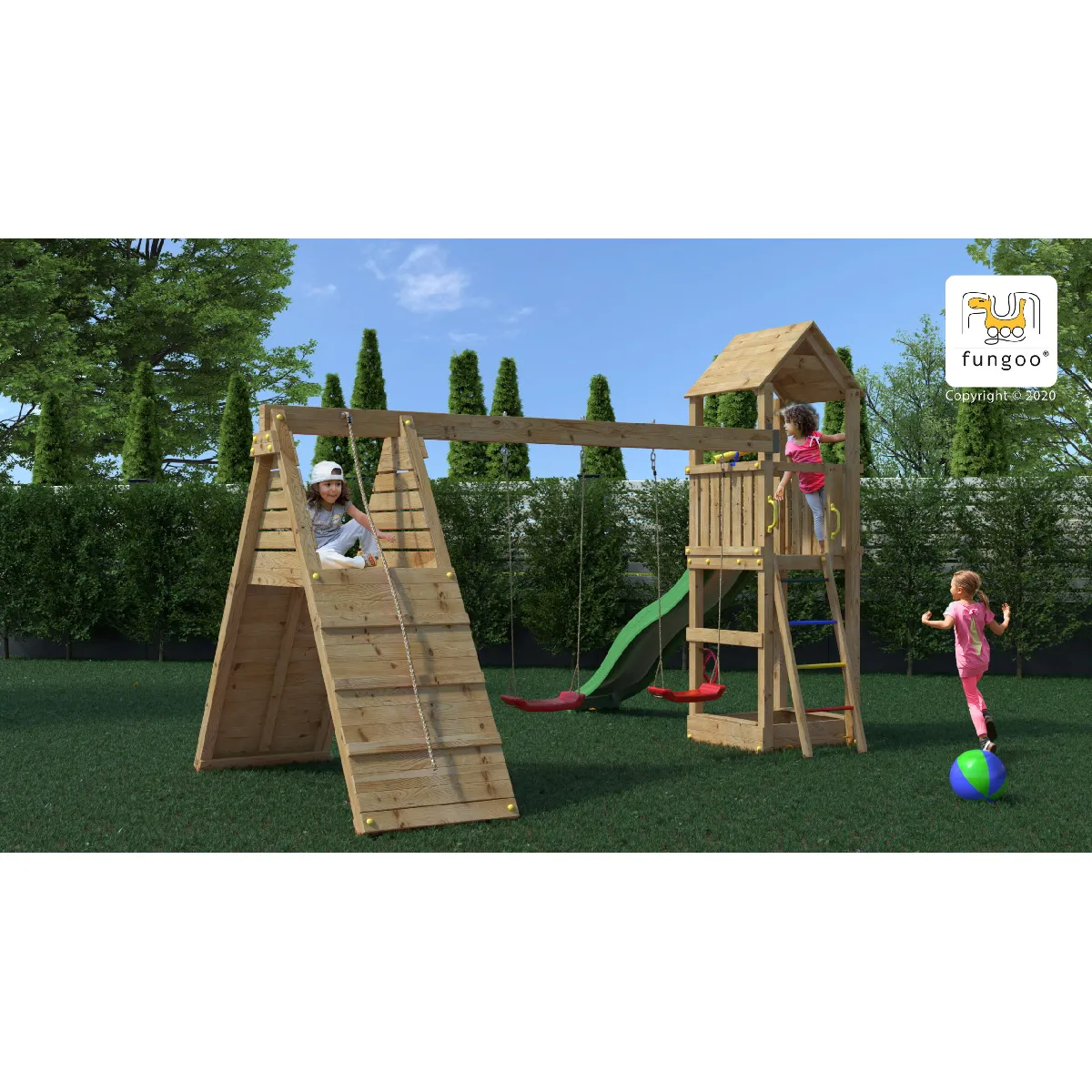 Commentaire vendeur : Aire de jeux Fleppi - Funggo.Nombre maximum d'utilisateurs : 9Bois en Pin Sylvestre Autoclave Classe 3 FSCNorme EN 71Temps de montage : 6 heures à 2 personnesGarantie : 10 ansÉquipement :Un toboggan de couleur vert avec glisse double vague mesurant 2,2 m.Une échelle à barreaux métalliques.Un portique doté de 2 balançoires rouges.Un mur d'escalade.Une rampe avec corde.Un bac à sable.Une cabane.Un volant et un téléscope.Dimensions :Longueur : 3,90 mLargeur : 4,10 mHauteur : 2,74 mSurface : 22,19 m²Hauteur plateforme : 1,25 mInstallation :Kit d'ancrage au solJeu de fixation métalliquesEnsemble d'outils d'installationInstructions d'installation "étape par étape" avec les règles de sécuritéPour la sécurité, des supports, des capuchons de protection et des poignées sont inclus.Caractéristiques techniquesÂge : 3 ans et +Bac à sable : NonBalançoire : OuiCabane : OuiCollection : FleppiCouleur : MarronDimensions (L x l x H) : 390 x 410 x 274 cmGarantie : 10 ansMarque : FUNGOOMatière(s) : BoisNombre d'utilisateurs maximum : 9Poids : 215 kgTemps de montage : 6 h à 2 personnesToboggan : OuiTraitement : AutoclaveType de bois : Pin Sylvestre
