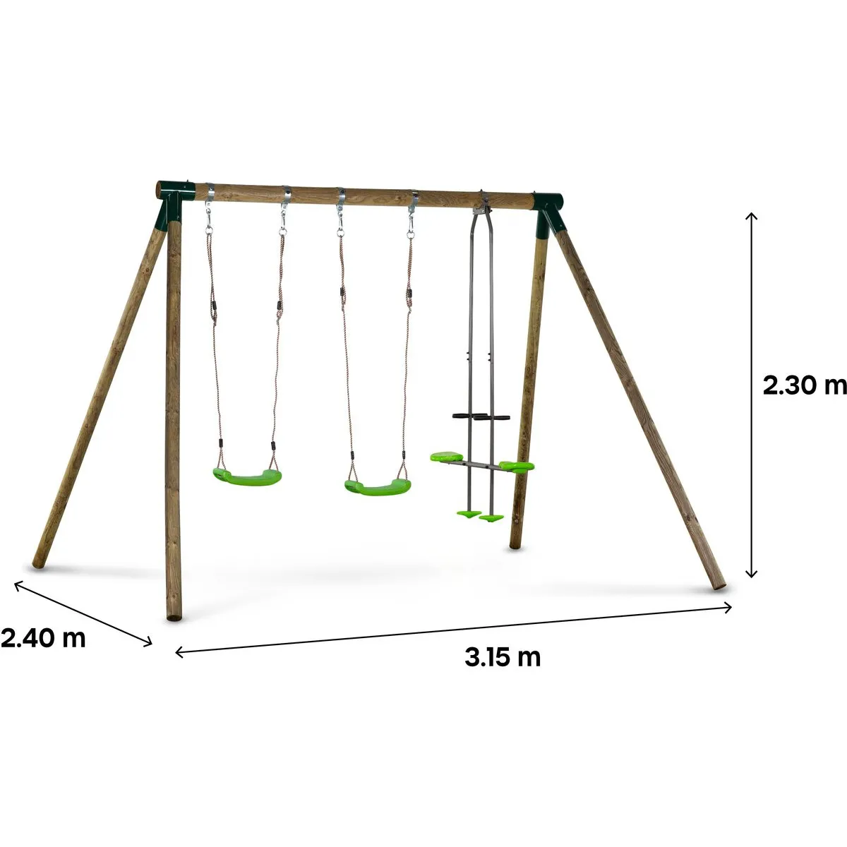 Portique bois "Lana"Idéal pour profiter de bons moments en plein air, le portique bois "Lana" permettra à vos enfants de passer des heures à se balancer. Ce portique est composé de 2 balançoires pour les amoureux du balancement et d'un vis-à-vis pour ceux qui préfèrent s'amuser à deux. La structure du portique "Lana" est faite en bois 100% FSC traité autoclave classe 3 contre les insectes et les pourritures garantie 10 ans. Il est certifié aux normes de sécurité des jouets enfants (EN71, 1 - 2 - 3 - 8).Les enfants sont des aventuriers qui débordent d'imagination et ont de l'énergie à revendre. Le portique bois "Lana" est ce qui leur faut ! Ils passeront ainsi d'agréables moments en plein air.Portique bois "Lana" - Avec 2 balançoires et 1 vis-à-vis - certifié 100% FSC traité autoclave classe 3 - 240 x 315 x 230 cm. .Dimensions: 315 x 240 x 230 cm