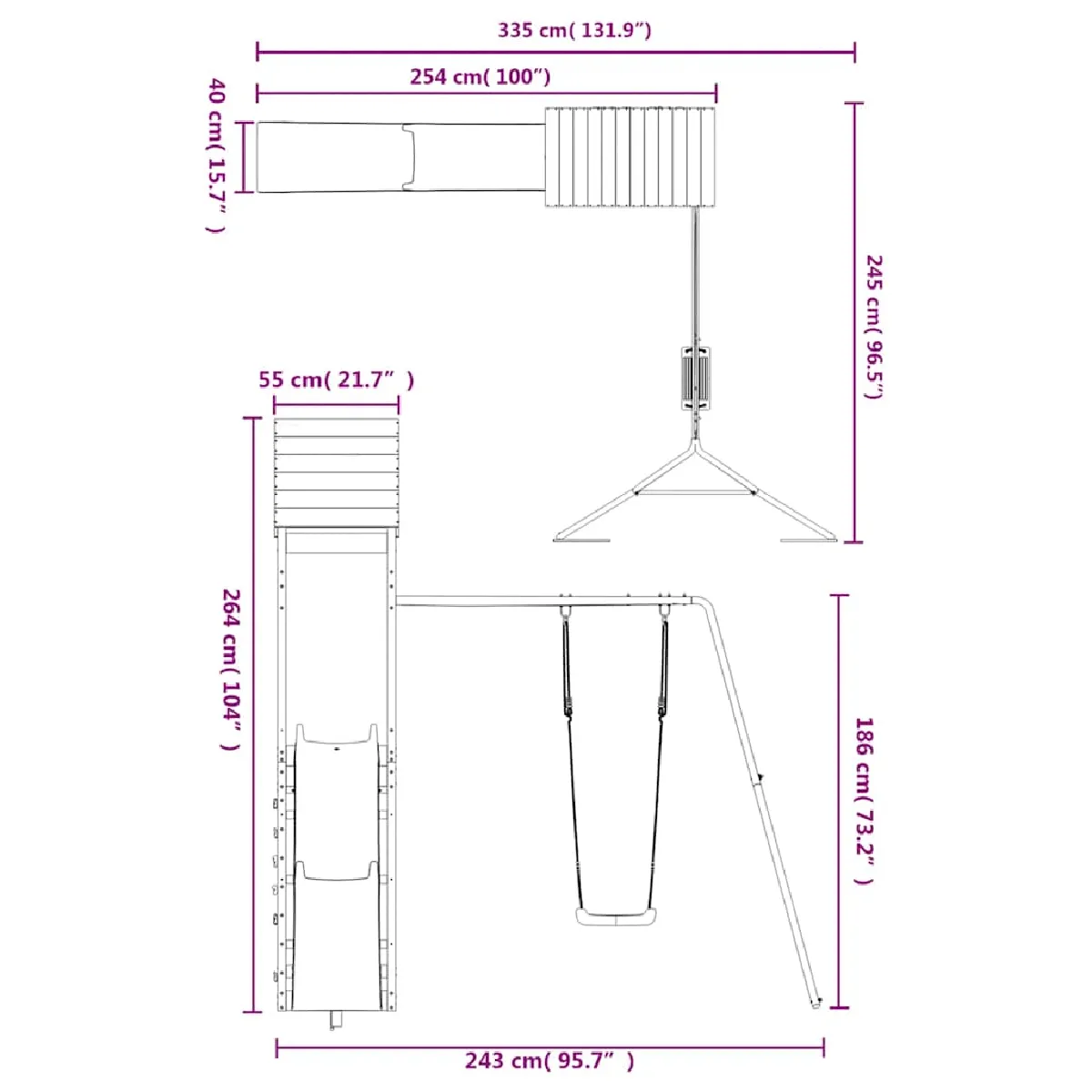 - Dimensions totales : 245 x 335 x 264 cm (L x l x H)