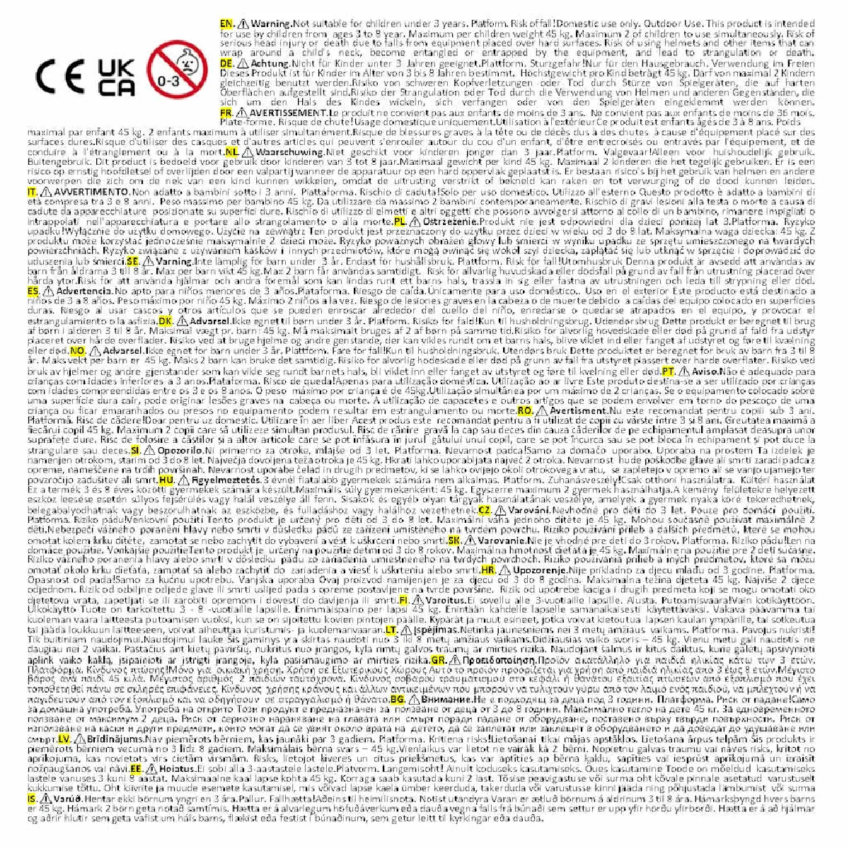 Avertissement. Ne convient pas aux enfants de moins de 3 ans. Usage domestique uniquement.