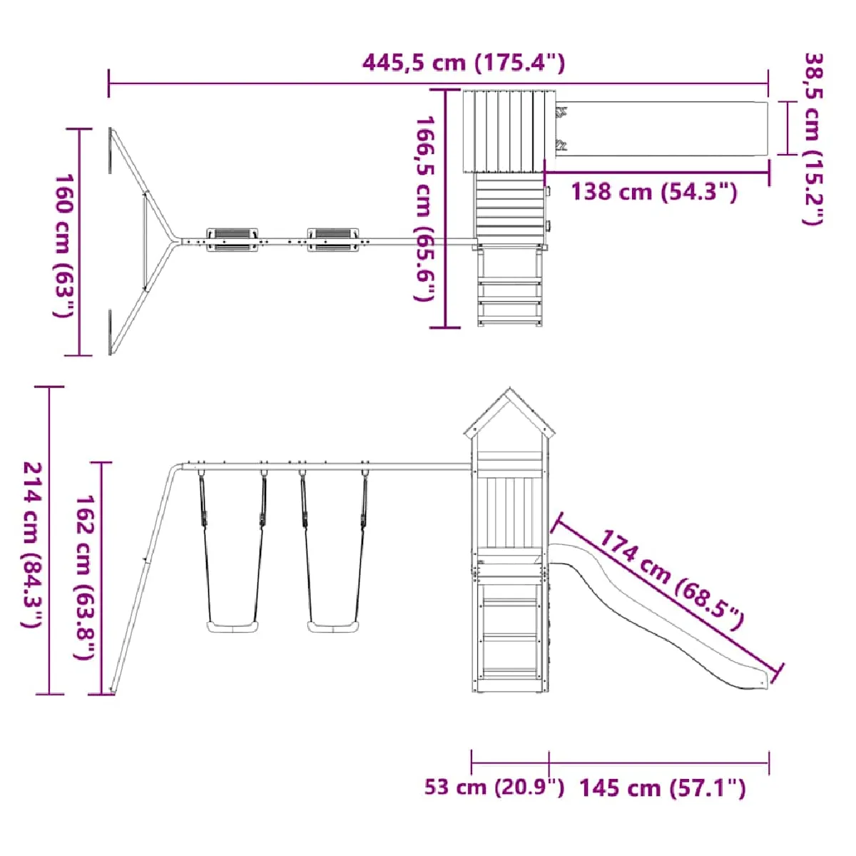 - Dimensions totales : 446 x 186 x 214 cm (L x l x H)