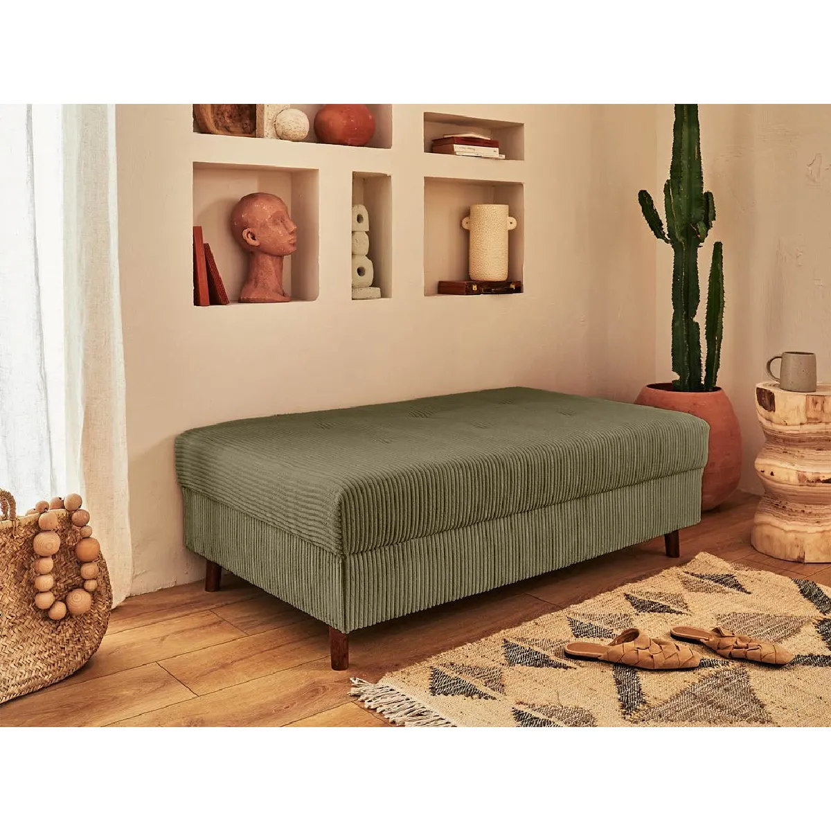 Idéal pour compléter un espace détente, ce pouf offre une assise large de 118 x 73 cm et une hauteur de 40 cm pour s'installer aisément. La structure mêlant bois massif et panneaux de particules assure une base stable, tandis que le revêtement en velours côtelé 100 % polyester apporte une touche douce au quotidien. Le confort provient d'une mousse de 30 kg/m3 soutenue par des ressorts zig-zags, pour une tenue régulière. Ses pieds en bois wengé, inclinés, facilitent le passage de l'aspirateur et ajoutent une note graphique à l'ensemble. Le montage se fait en quelques dizaines de minutes, notice incluse.