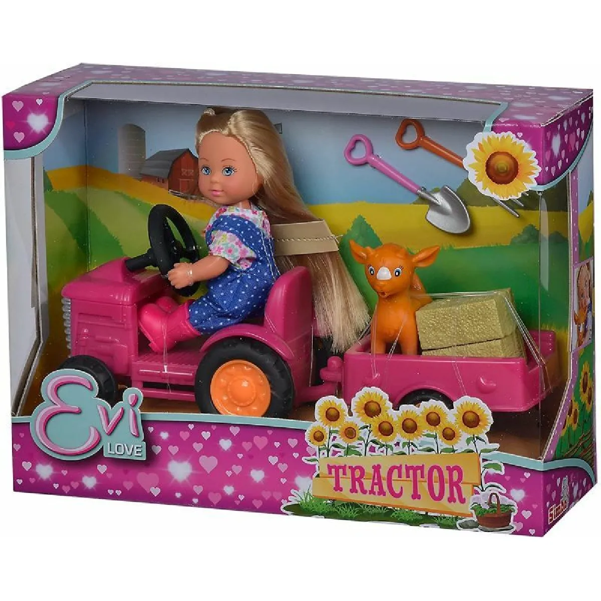 La couleur rose apporte une touche ludique dans un univers de ferme, sans complexifier le jeu. L'ensemble non interactif favorise l'imagination libre et l'invention de scénarios, sans piles ni réglages. Le thème poupées permet d'associer ce set à d'autres accessoires de la même échelle afin d'étendre l'univers de jeu. La poupée Evi Love fermière avec son tracteur soutient des activités calmes, structurées et répétitives, utiles pour développer la narration, la motricité fine et la concentration lors de petites sessions de jeu.
