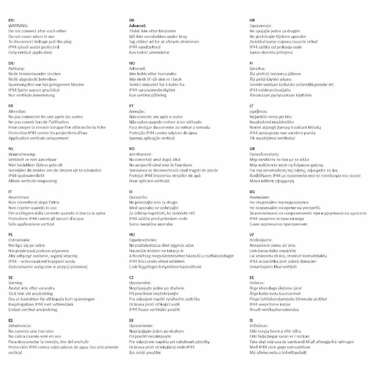 - Charge totale maximale (toutes les 4 prises) : 3 680 W, 16 A / 250 V ~