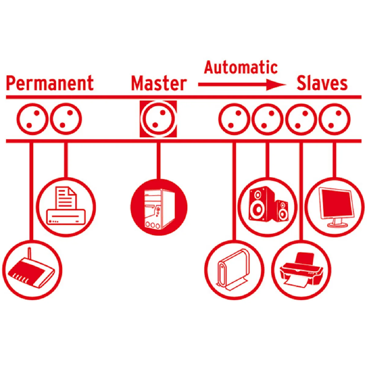 - Lors de la mise en marche du dispositif branché dans la prise principale ON / OFF, tous les autres appareils branchés sur les prises esclaves seront également automatiquement commuté ON / OFF
