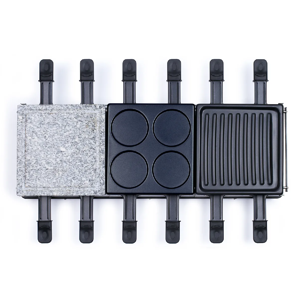 3 plateaux différents pour un usage varié : une pierre à griller, un gril et un plateau mini crêpes