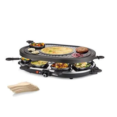 La forme ovale optimise l'accès pour tous autour de la table et laisse de la place aux accompagnements. La surface de grill accueille simultanément plusieurs ingrédients tandis que la zone centrale prépare des crêpes pour varier les plaisirs au cours d'un même repas. Avec 8 coupelles à raclette, chacun fond son fromage, réchauffe des garnitures ou finalise une recette sans attendre. L'appareil convient aux repas conviviaux jusqu'à 8 personnes, en alternant entre grillades et douceurs sucrées ou salées.