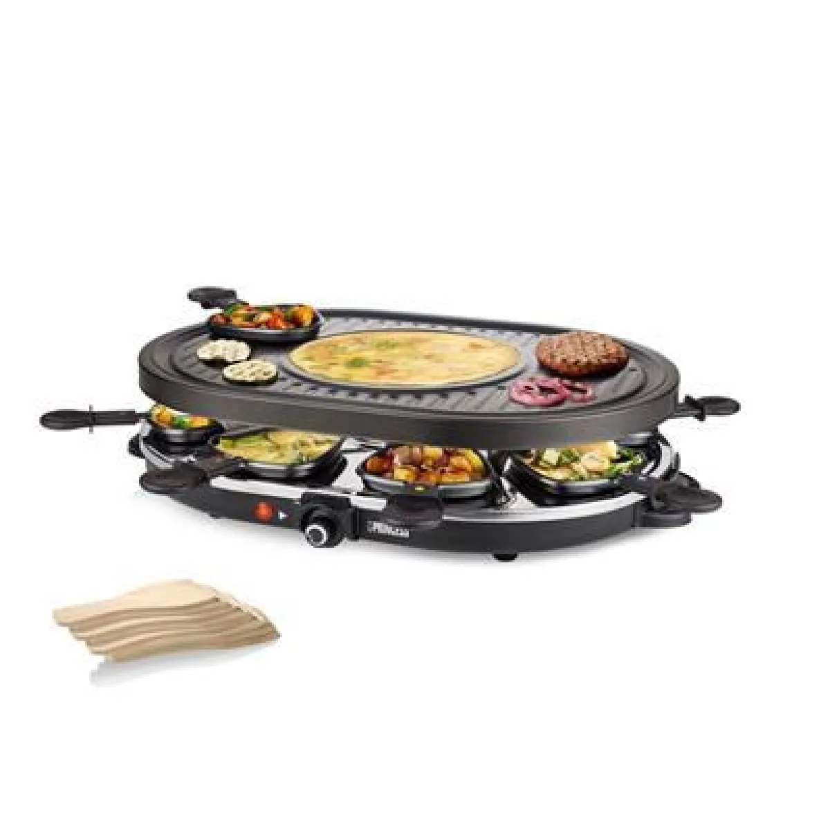 Appareil à raclette et gril ovale - 1200 W - Thermostat réglable - 8 poêlons antiadhésifs - Plaque amovible lavable au lave-vaisselle