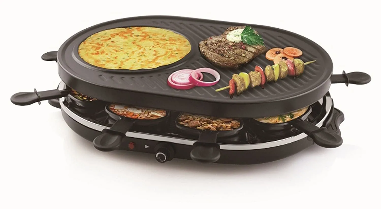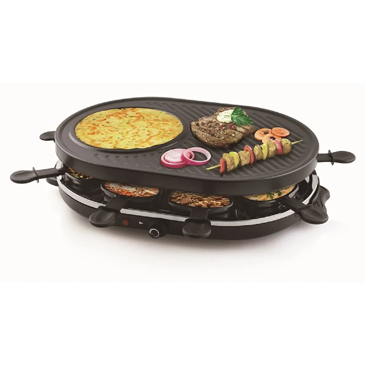 Appareil à raclette multifonctions - Plancha/gril, crêpière, thermostat réglable, antiadhésif, 1200 W, 8 poêlons