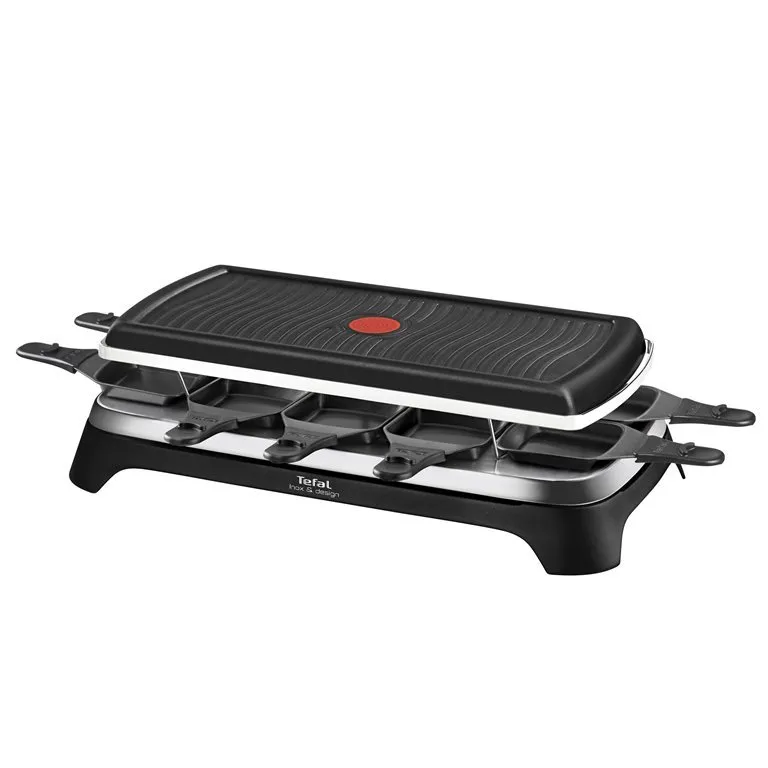 Commentaire vendeur : RE458812-Raclette pour 10 personnes de couleur inox Thermostat reglable fonction grill Plaque anti adhesive et accessoires 10 poelons Cordon d alimentation amovible